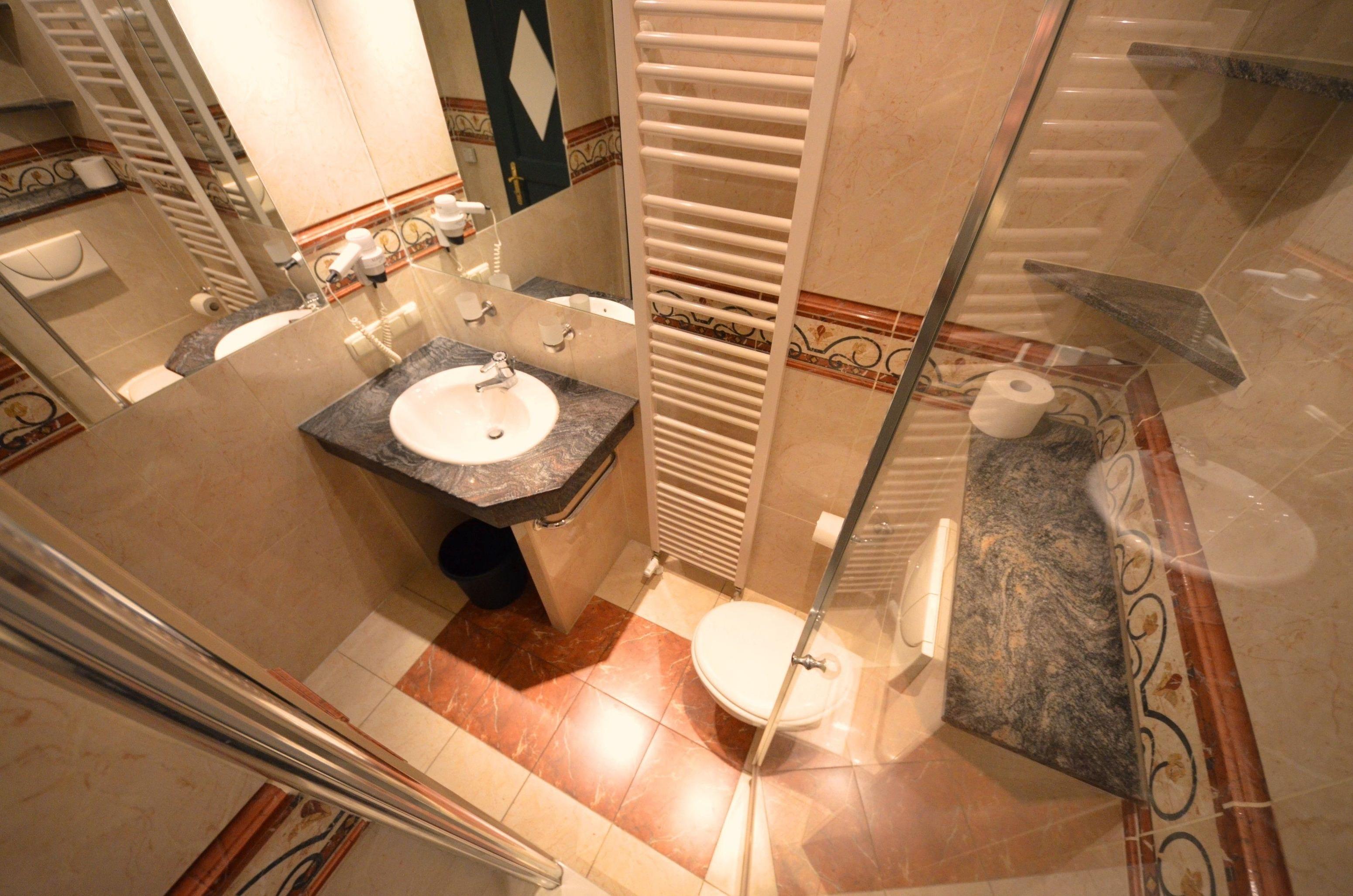 Glas – Dusche, Granitverkleidung, Fön, Schminkspiegel. Fußbodenheizung, Natursteinabdeckungen, schöne Sanitärausstattung, beheizbarer Handtuchhalter,