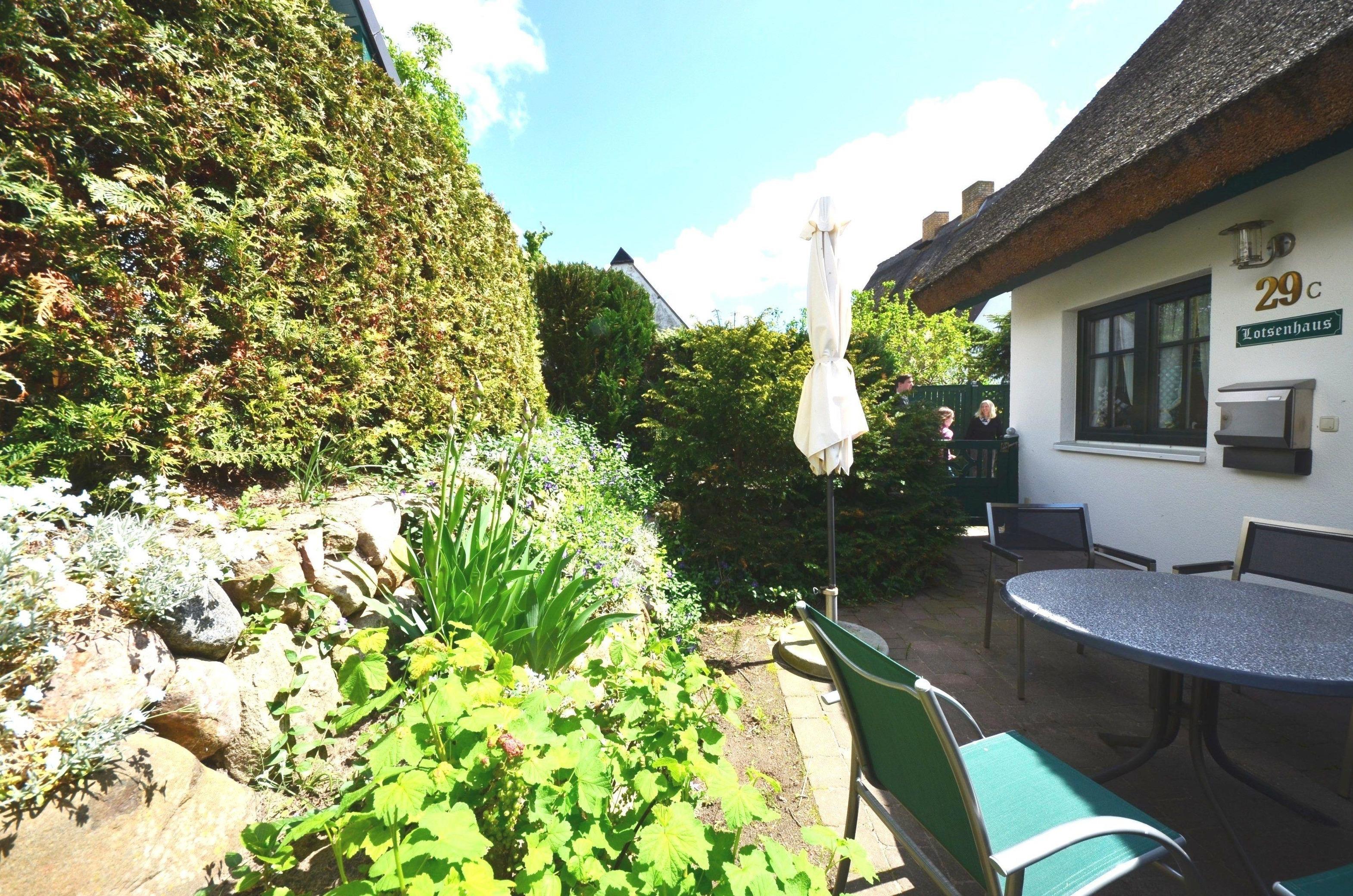 Vor der Haustür gibt es eine schöne eingewachsene Terrasse mit Gartenmöbeln.