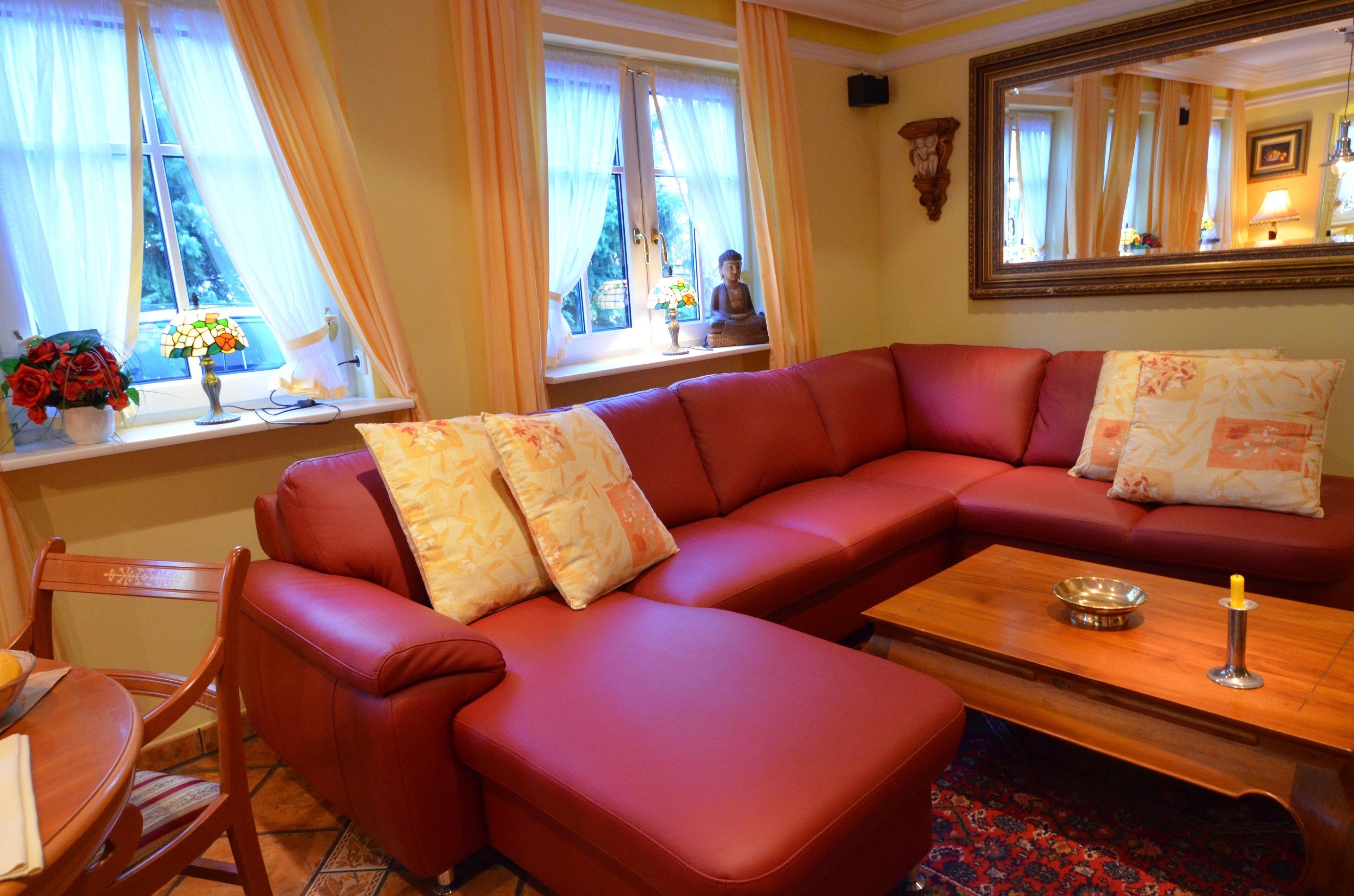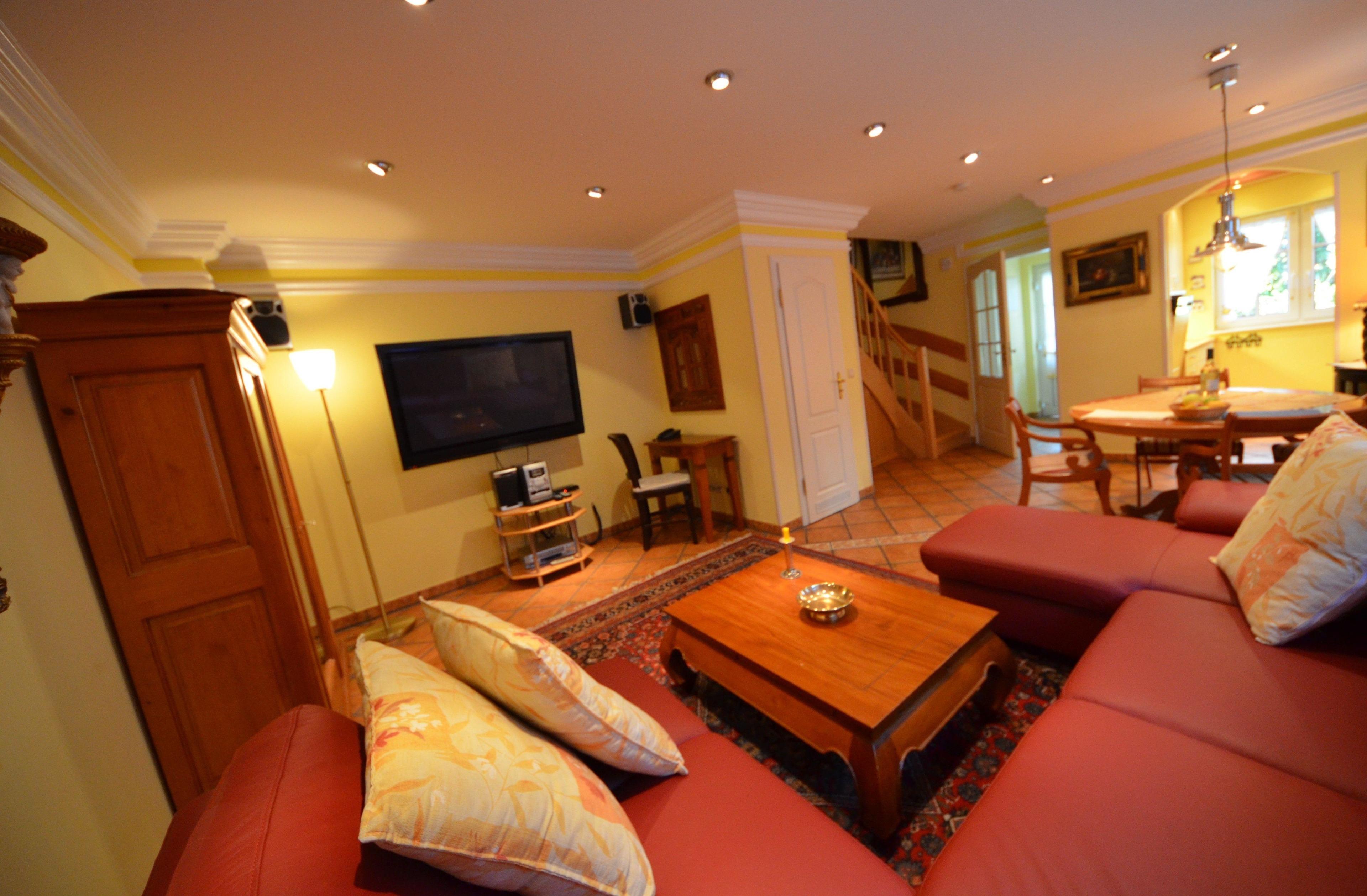 Gemütliches Wohn- Esszimmer, Fußbodenheizung, Esstisch für 4 Personen, schöne Leder-Couch-Garnitur und Opiumtisch, 50" (125cm) TV, WLAN, Stereo / CD, antiker Geschirrschrank, Telefontisch mit Telefon und balinesischem Spiegel, Kinderhochstuhl, Wände dekoriert mit Bildern,