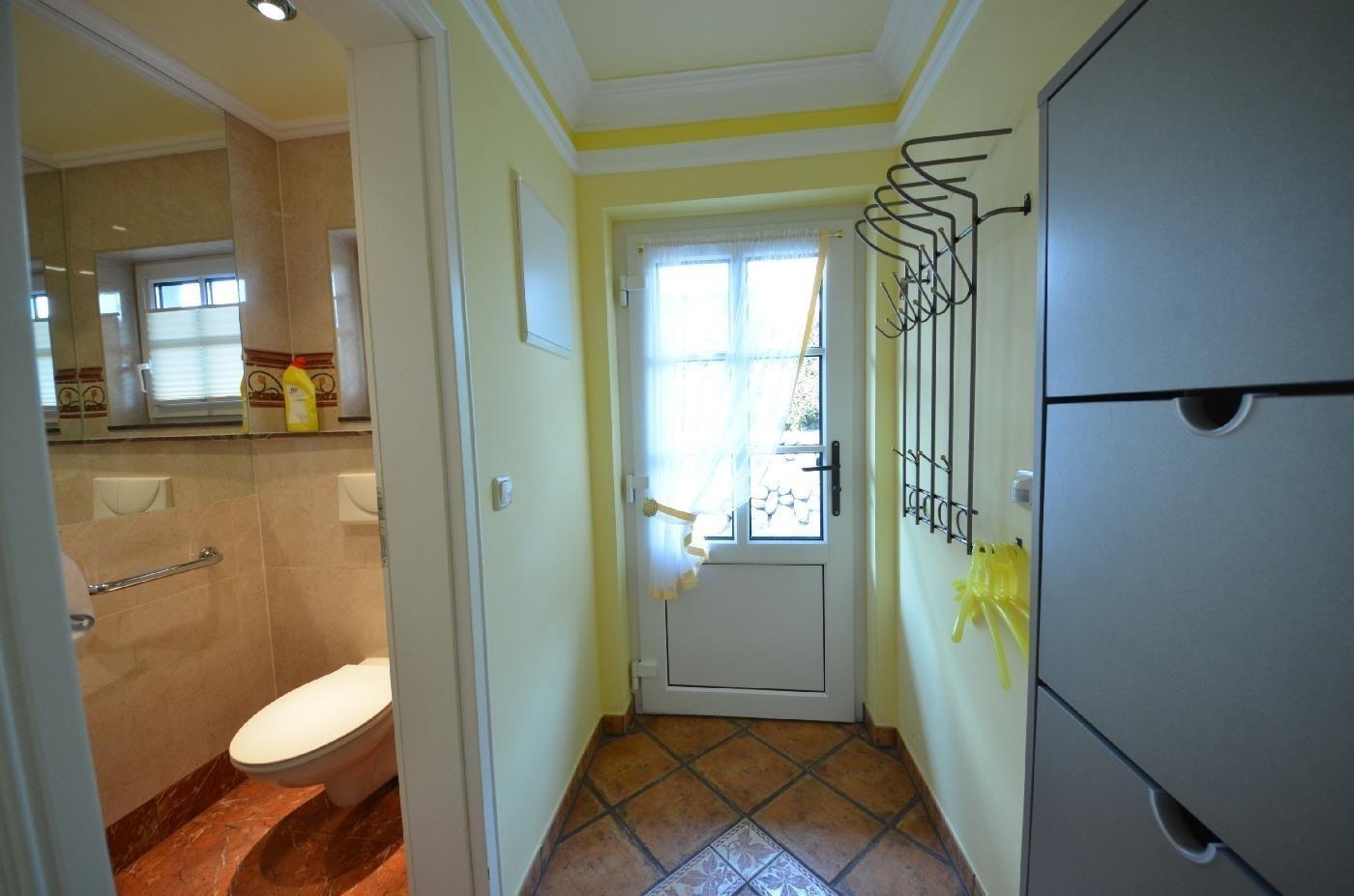 Im Haus gibt es eine Gästetoiletten und ein Bad mit WC, beide im creme - Farbton Pergamon.