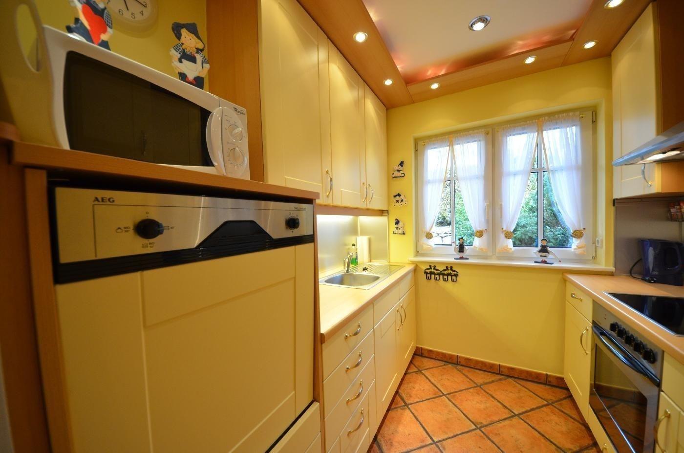 Fußbodenheizung, schöne moderne Einbauküche in arktisgelb, höher gelegter Geschirrspüler, Mikrowelle, Herd mit Ceran - Kochfeld Turmhaube und Backofen, Kühlschrank mit Gefrierteil,