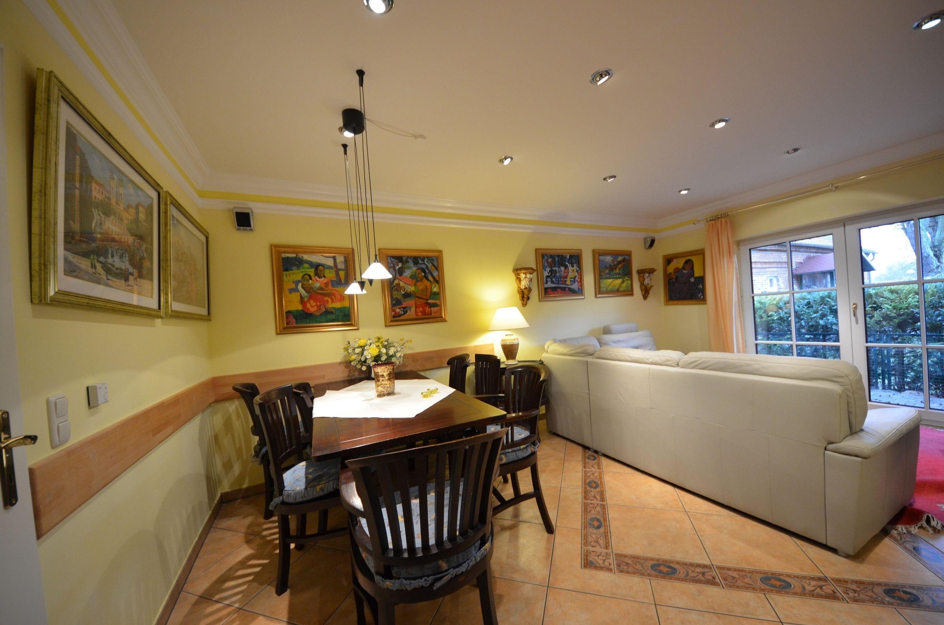 Wohn- Esszimmer mit Ausgang zur Terrasse mit Gartenmöbeln,