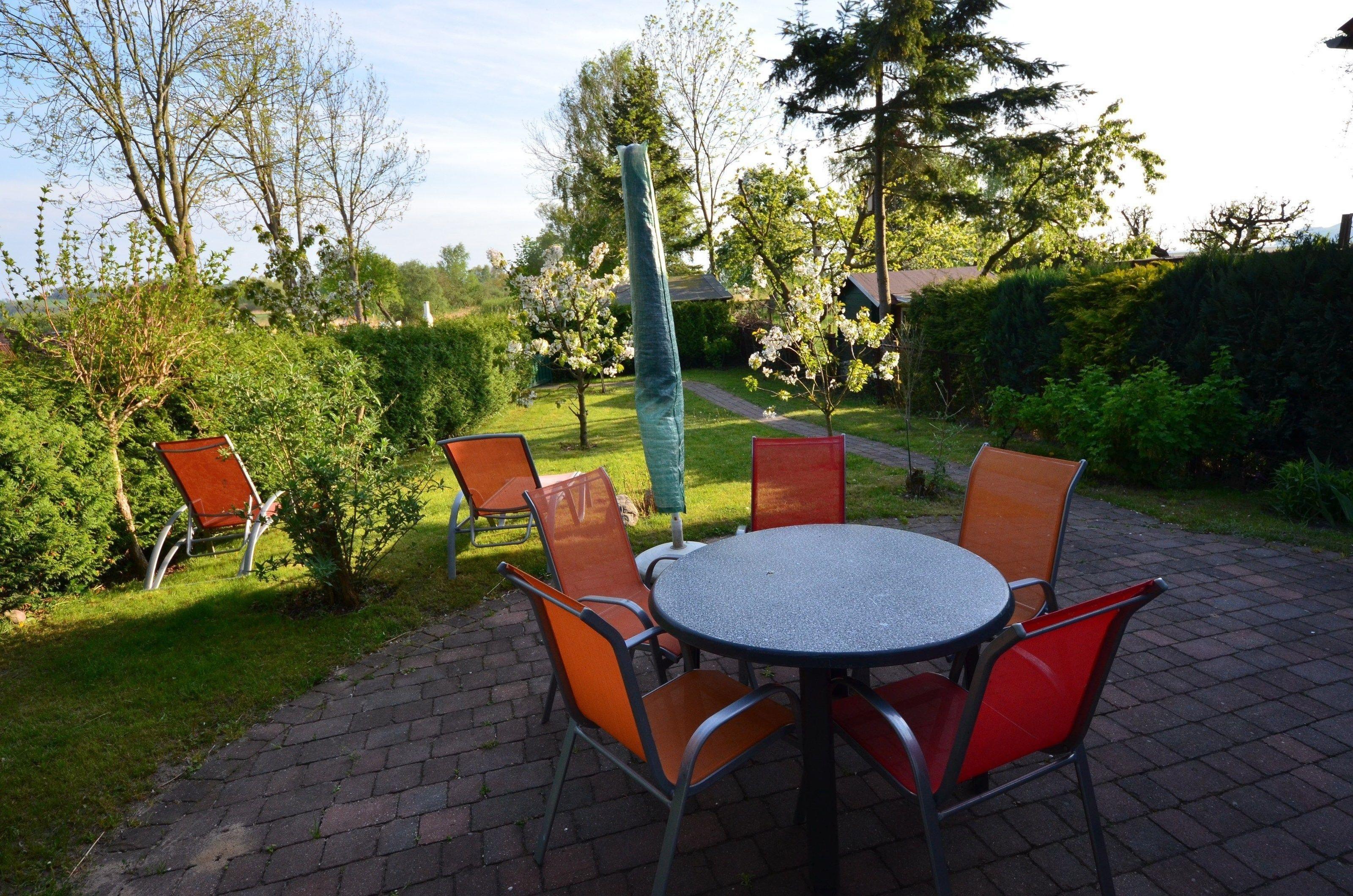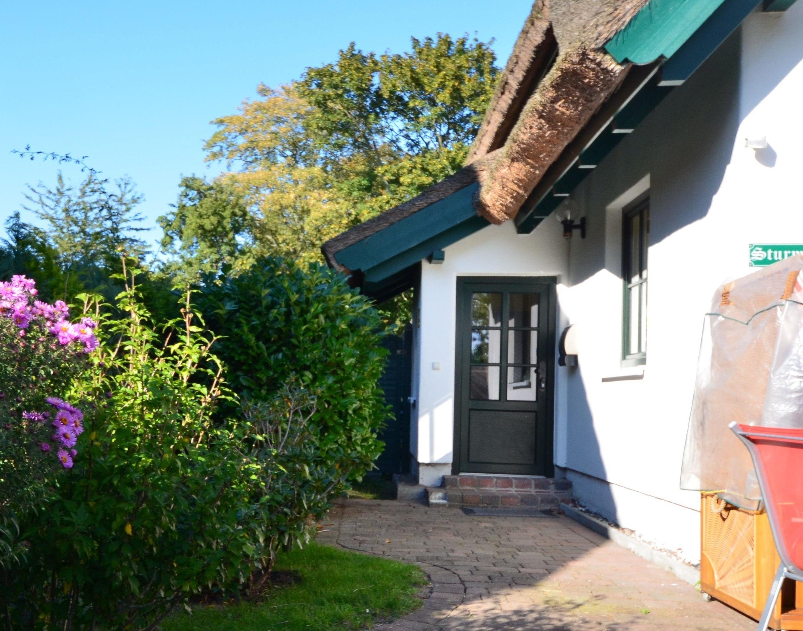 Das Haus hat einen eigenen separaten Eingang, einen kleinen Garten mit Terrasse, Gartenmöbeln und Strandkorb.
