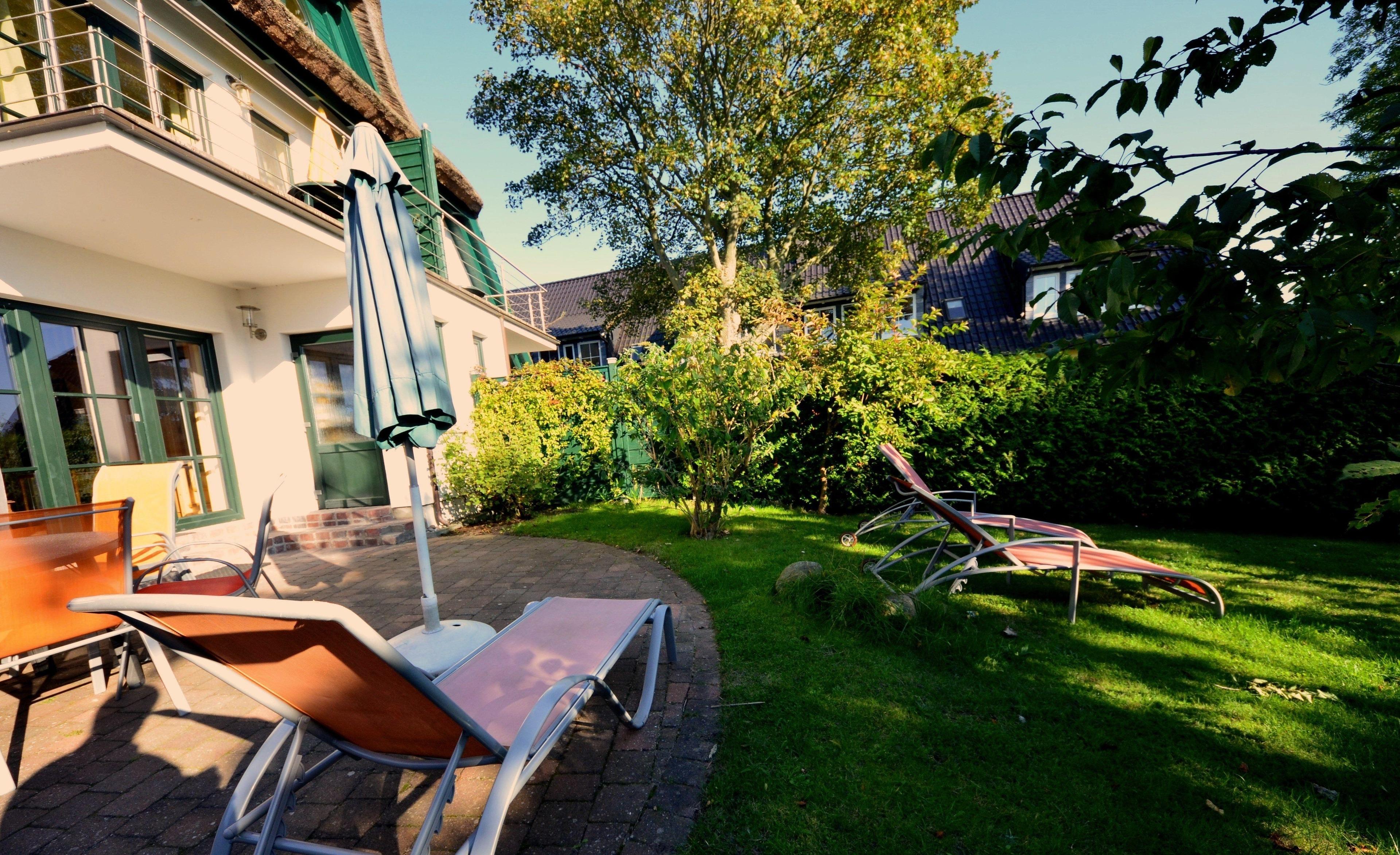 Das Haus hat eine Terrasse mit Gartenmöbeln, eigenem Gartenteil, Doppelstrandkorb