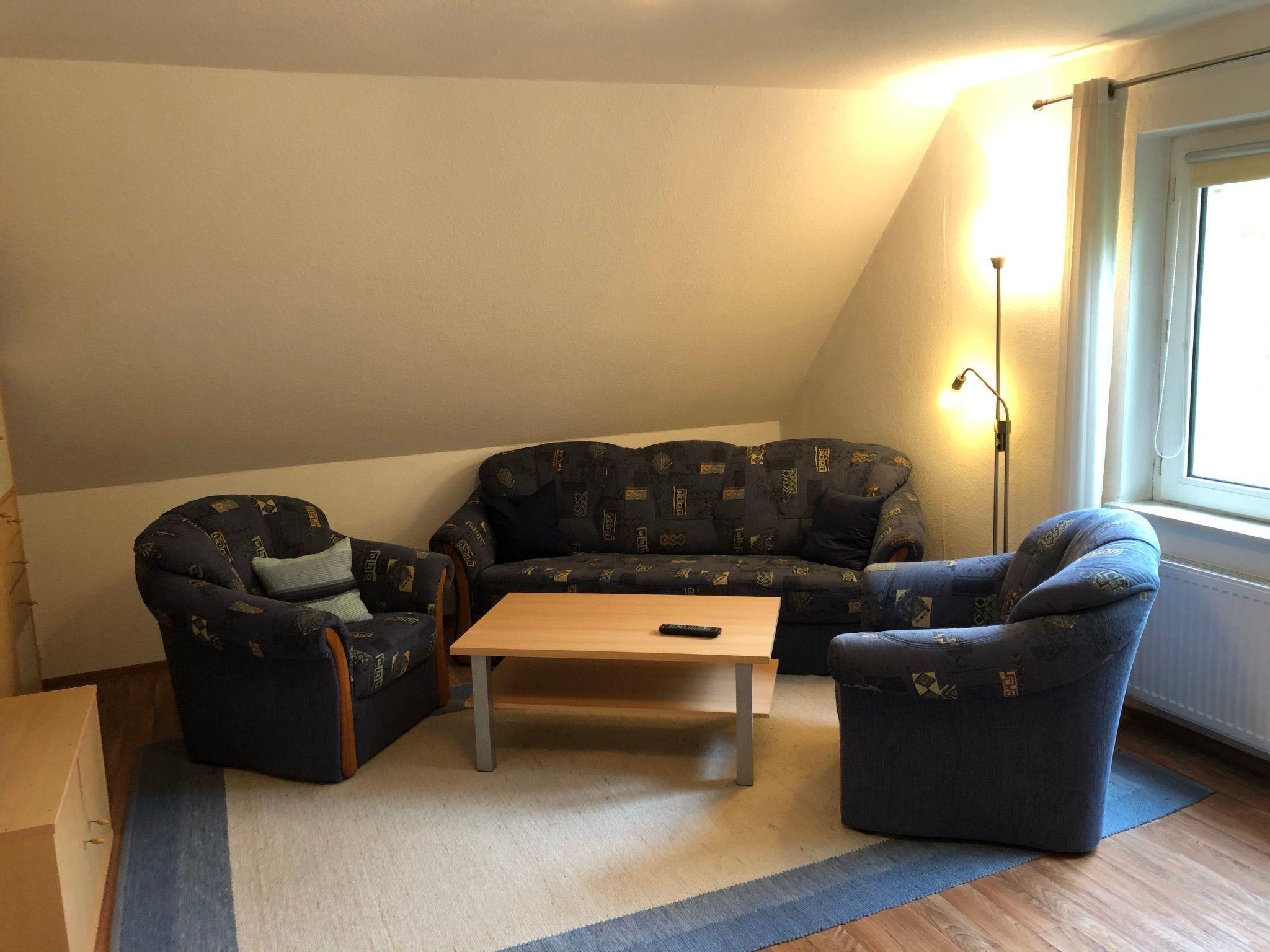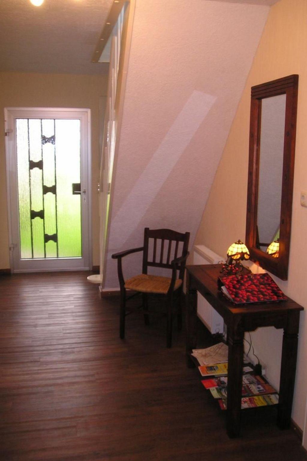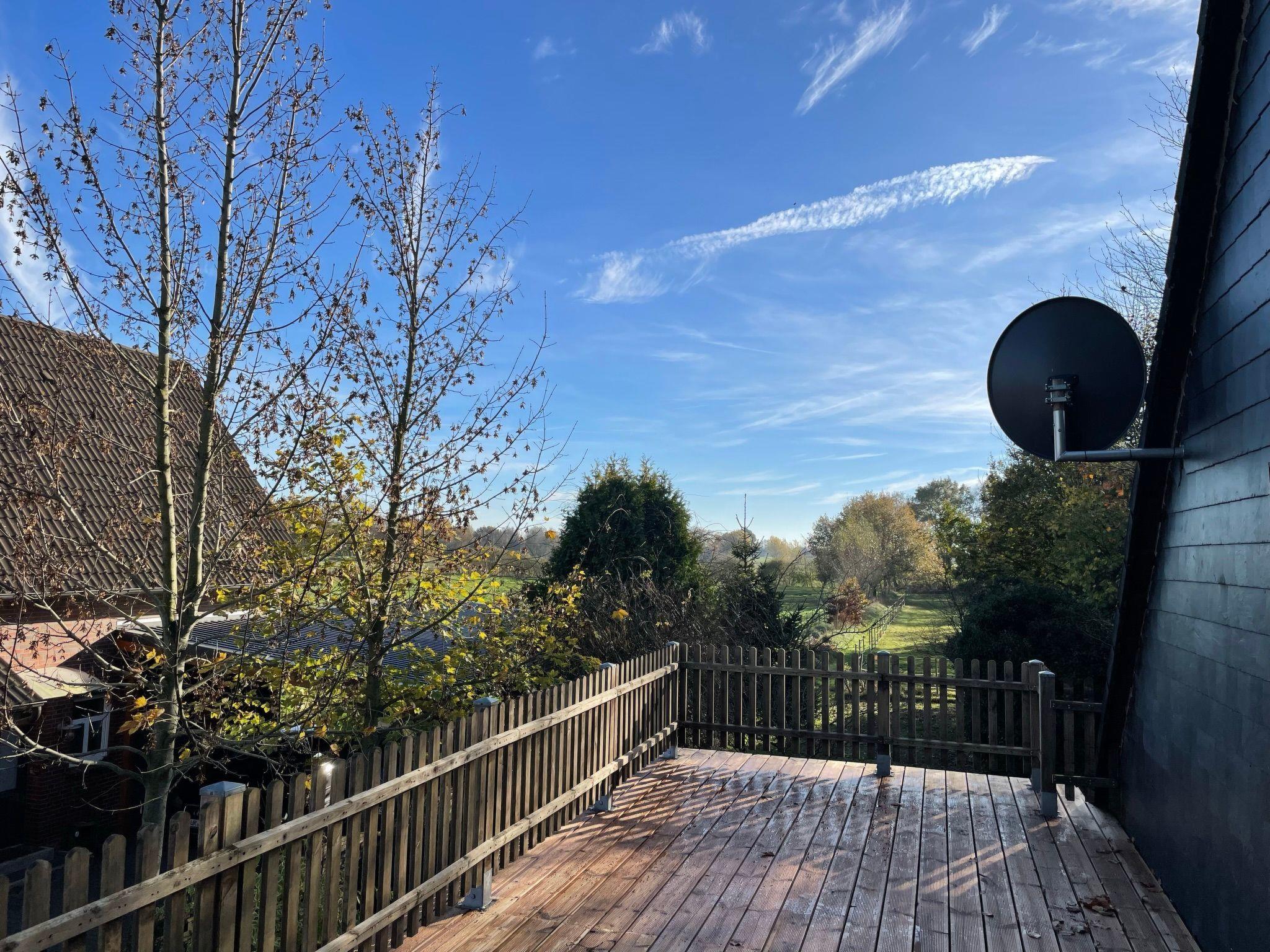You can reach all rooms via a hallway with staircase. The kitchen and living room are located in a modern, spacious room. In addition to a cosy seating area with leather couch and wood-burning stove, there is also a dining table with four chairs. The kitchen is fully equipped, including a dishwasher. In the living area you will find satellite TV and a DVD player. From the kitchen you can reach the south-facing terrace with an unobstructed view of the meadows and fields. On the ground floor you will also find the modern bathroom with shower and bathtub, the WC (extra) and a bedroom with a double bed. The second bedroom is located on the upper floor of the house. It is equipped with another satellite TV, a sitting area with a couch and two armchairs. The smallest room is 6 square metres in size and is furnished with a single bed, a small desk and a bedside table. It can be used as a study or playroom. Internet access is via WLAN (Vodafone Gigacube, 4G) and is available throughout the house and on the terrace.