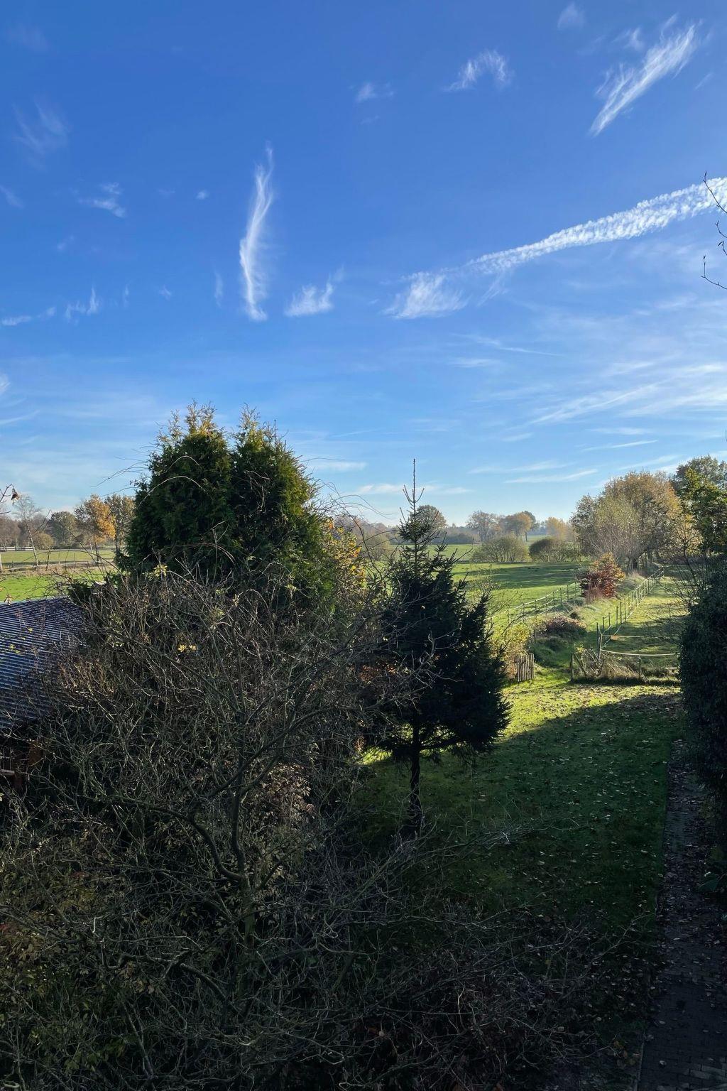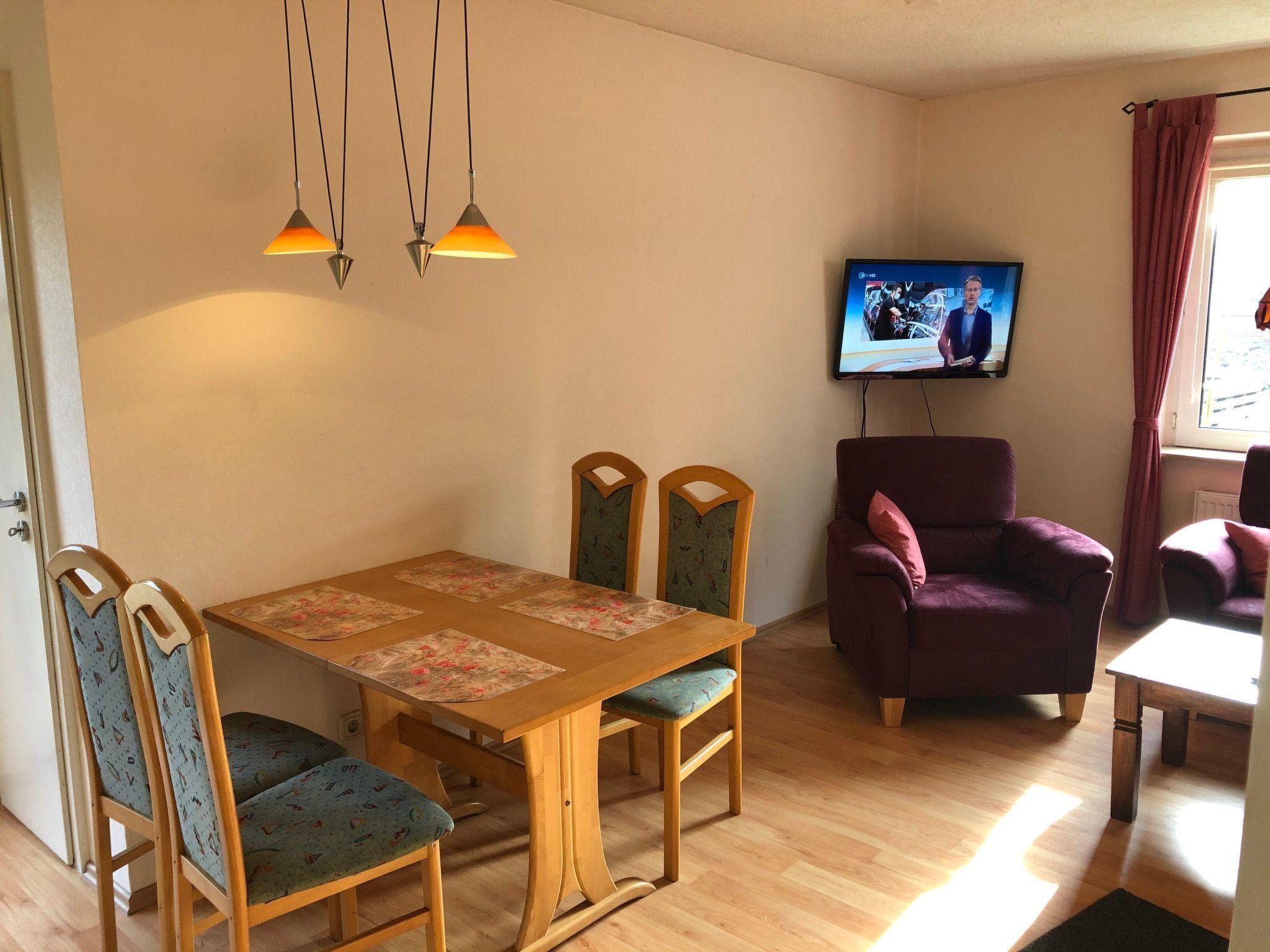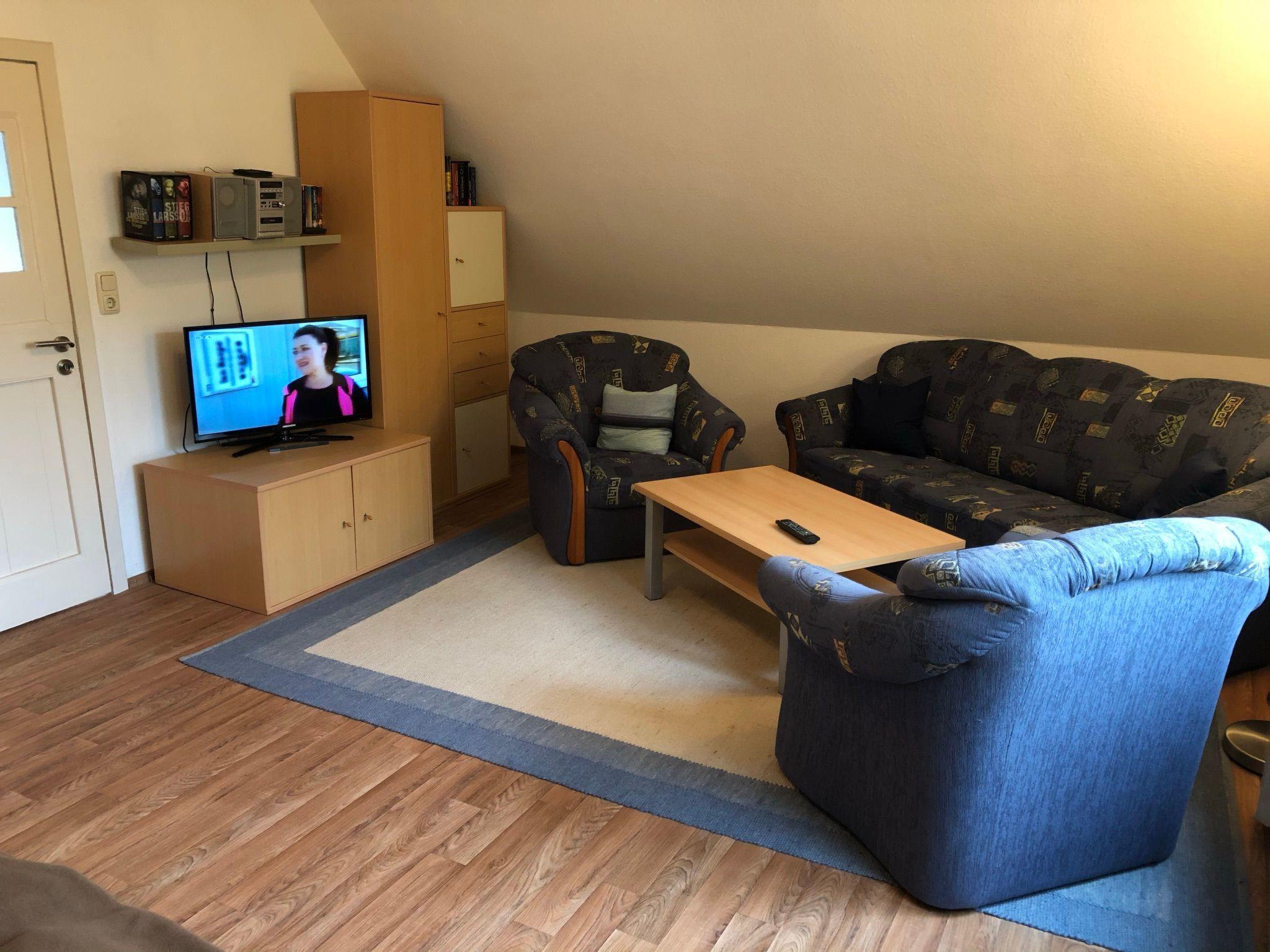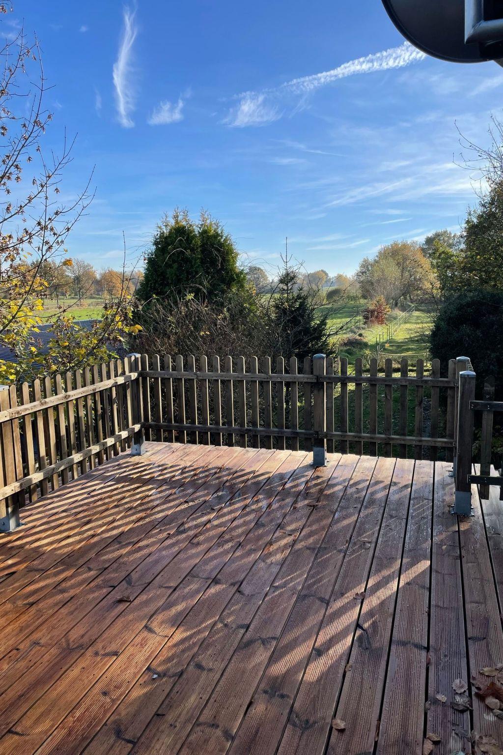 You can reach all rooms via a hallway with staircase. The kitchen and living room are located in a modern, spacious room. In addition to a cosy seating area with leather couch and wood-burning stove, there is also a dining table with four chairs. The kitchen is fully equipped, including a dishwasher. In the living area you will find satellite TV and a DVD player. From the kitchen you can reach the south-facing terrace with an unobstructed view of the meadows and fields. On the ground floor you will also find the modern bathroom with shower and bathtub, the WC (extra) and a bedroom with a double bed. The second bedroom is located on the upper floor of the house. It is equipped with another satellite TV, a sitting area with a couch and two armchairs. The smallest room is 6 square metres in size and is furnished with a single bed, a small desk and a bedside table. It can be used as a study or playroom. Internet access is via WLAN (Vodafone Gigacube, 4G) and is available throughout the house and on the terrace.