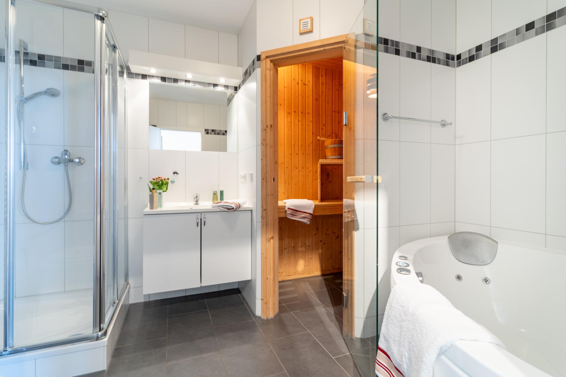 Die Krönung eines jeden Tages bietet das atemberaubende Wellnessbad mit Sauna und Whirlpool, das Sie einlädt, ein paar Stunden in einem harmonischen Ambiente bei Kerzenschein entspannen zu können.