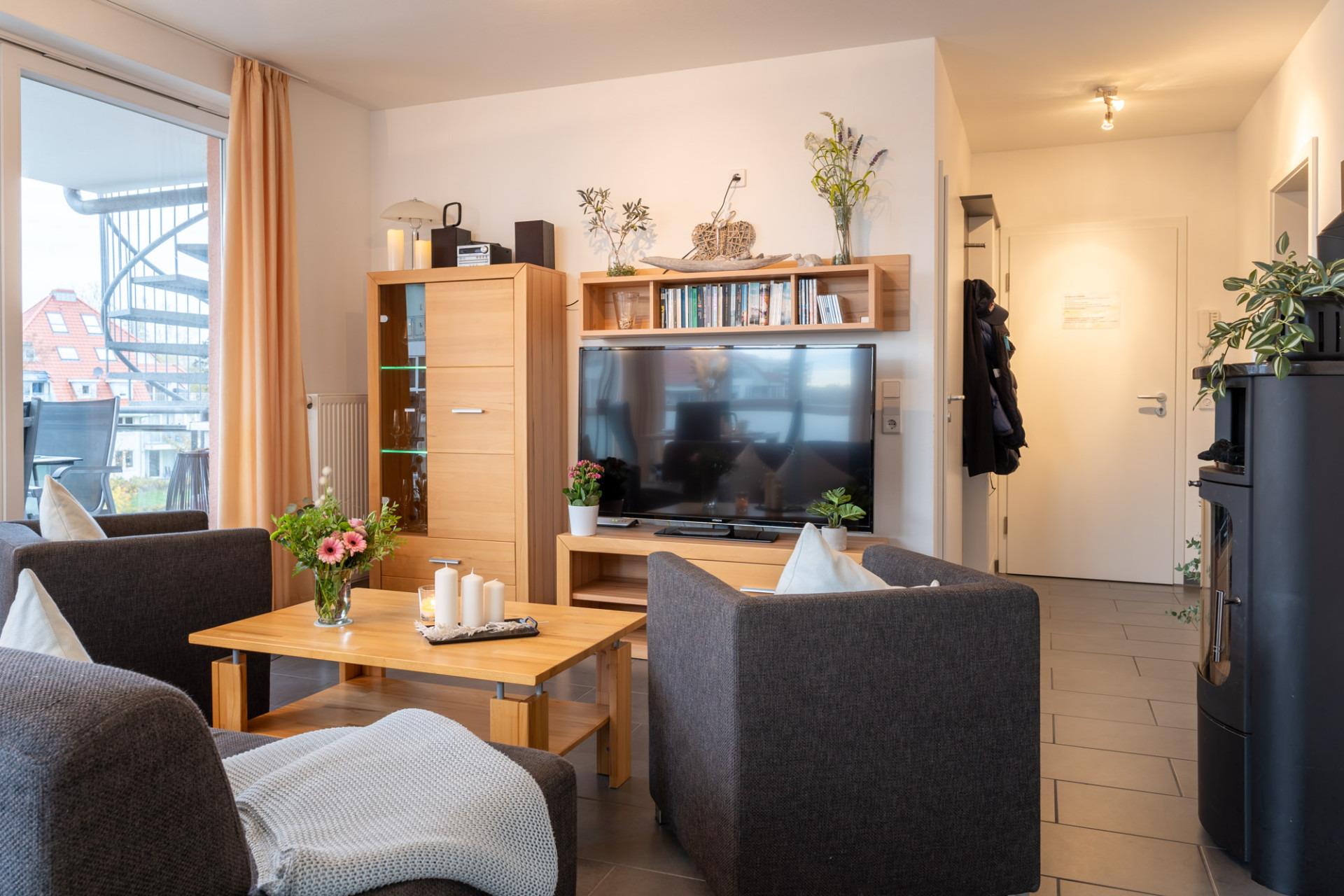 Des Weiteren haben Sie die Möglichkeit, in einem gemütlichen und freundlichen Wohnraum romantische Stunden bei einem wärmenden Kaminfeuer zu verbringen. Außerdem ist ein DVD- und ein CD-Player sowie eine umfangreiche Auswahl an DVD's, CD's, Spielen und Büchern vorhanden.