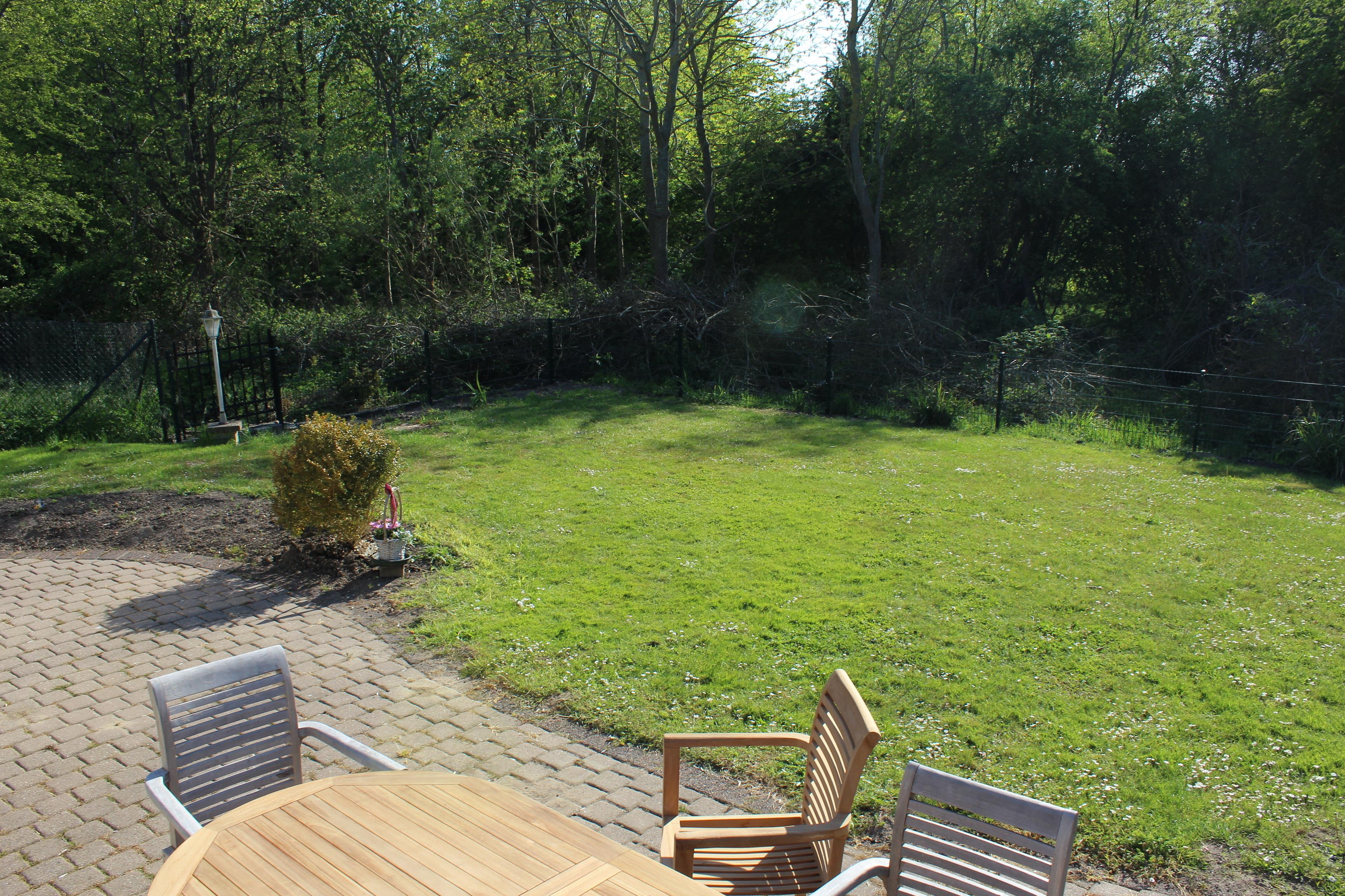 Der Garten ist eingezäunt und hat noch eine Terrasse mit einer Markise.