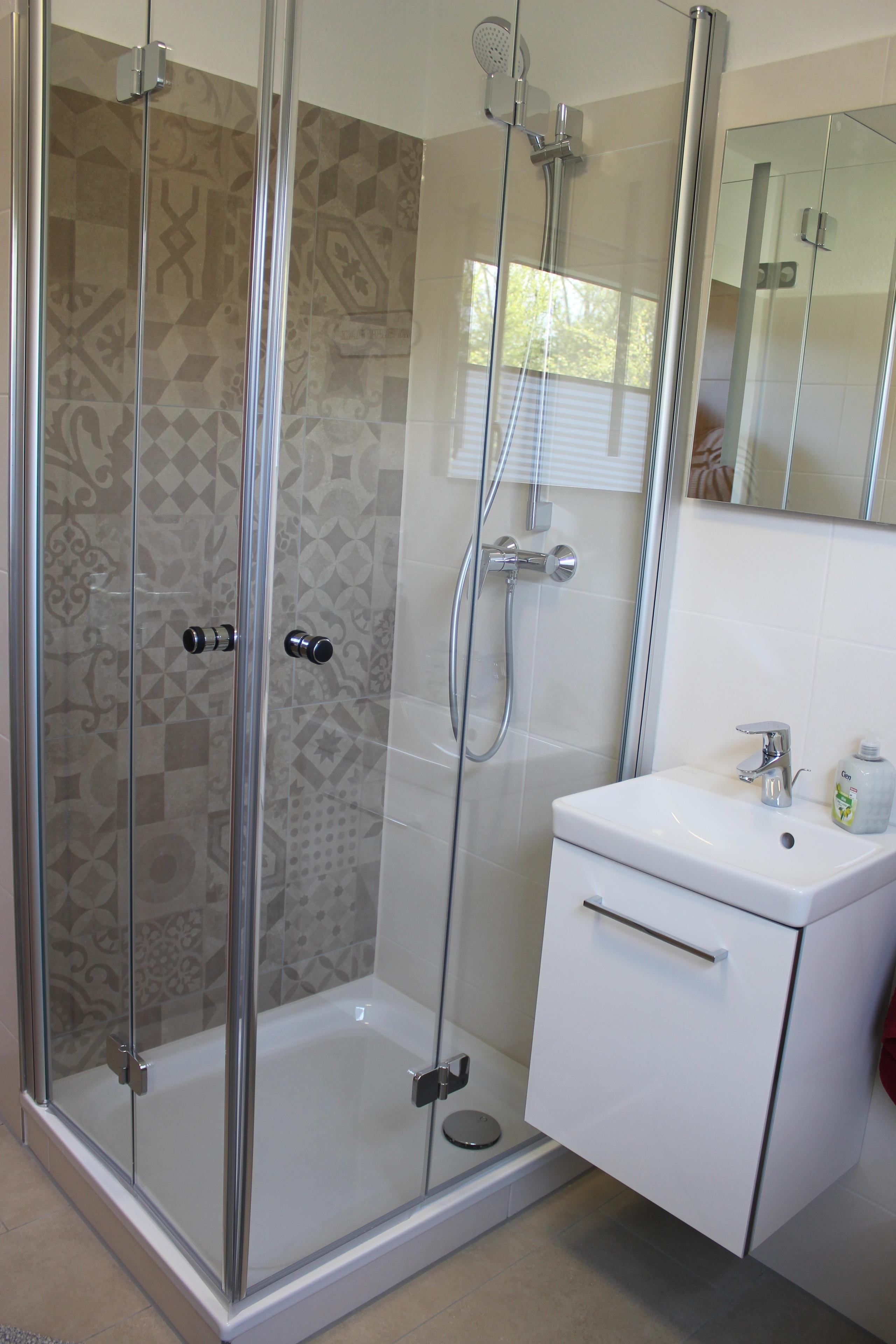 1 Bad, mit Dusche, Waschtisch, Toilette und Schränkchen