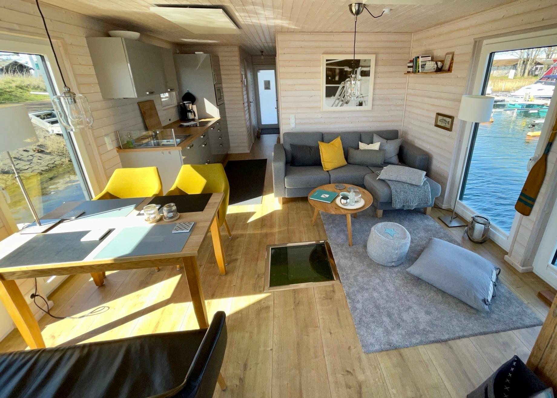 Integrierte, sehr gut ausgestattete Küchenzeile mit Gasherd und Mikrowelle, der Essplatz für 4 Personen direkt am Wasser, offener und gemütlicher Wohnbereich mit Blick auf die Boote.