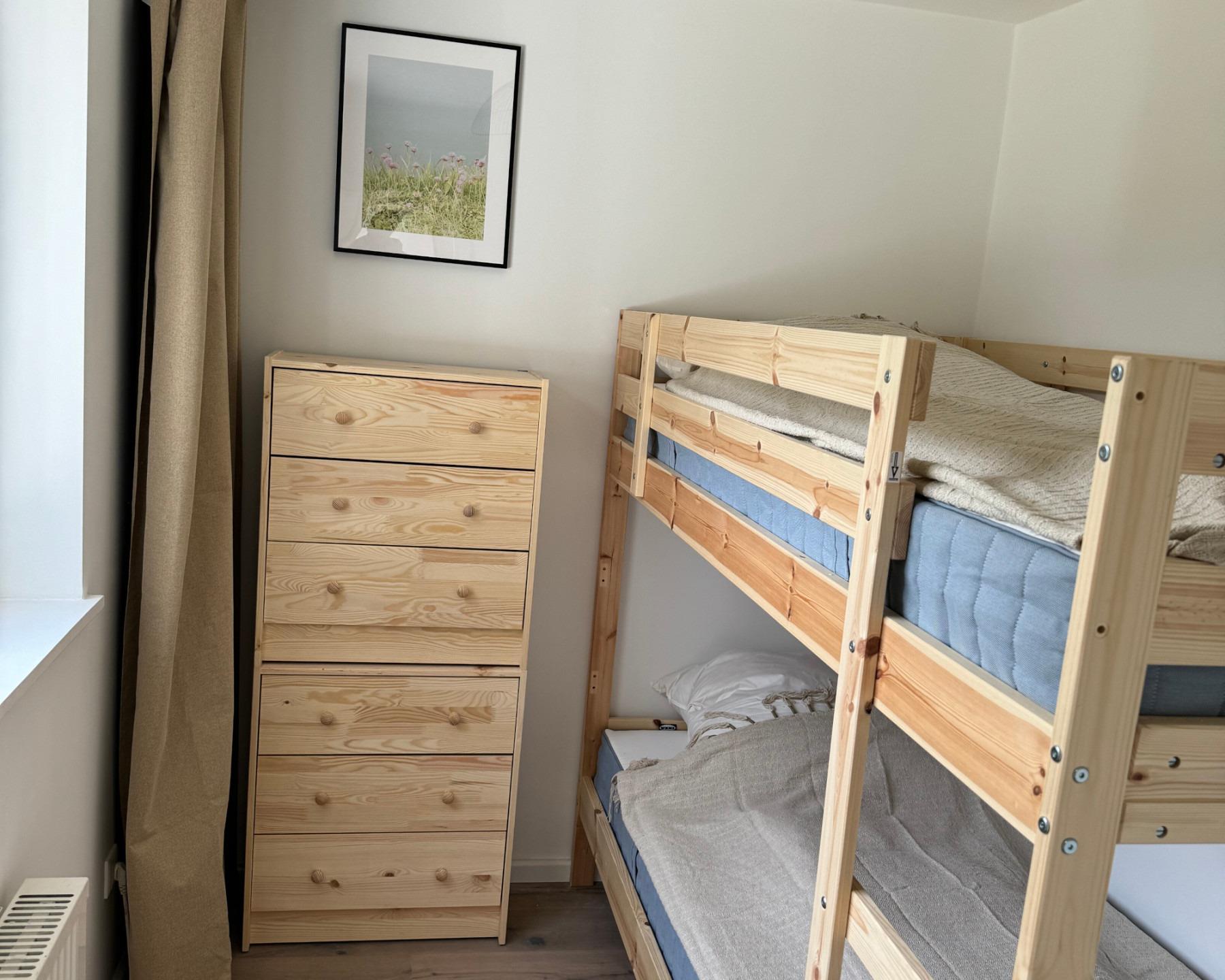 Das Hauptschlafzimmer ist mit einem komfortablen Doppelbett ausgestattet; das weitere Schlafzimmer verfügt über ein praktisches Hochbett, ideal für Familien mit Kindern.