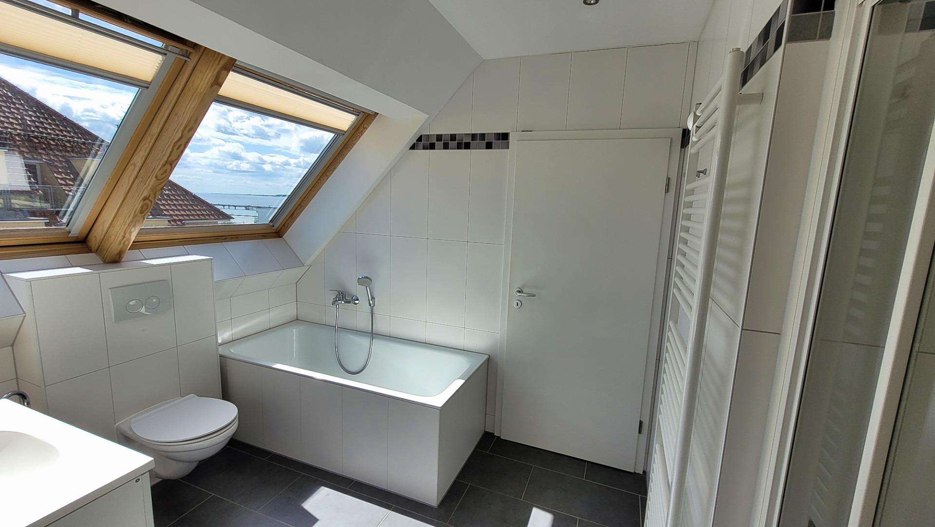 Das Bad verfügt über Dusche mit Handtuchwärmer und Badewanne.