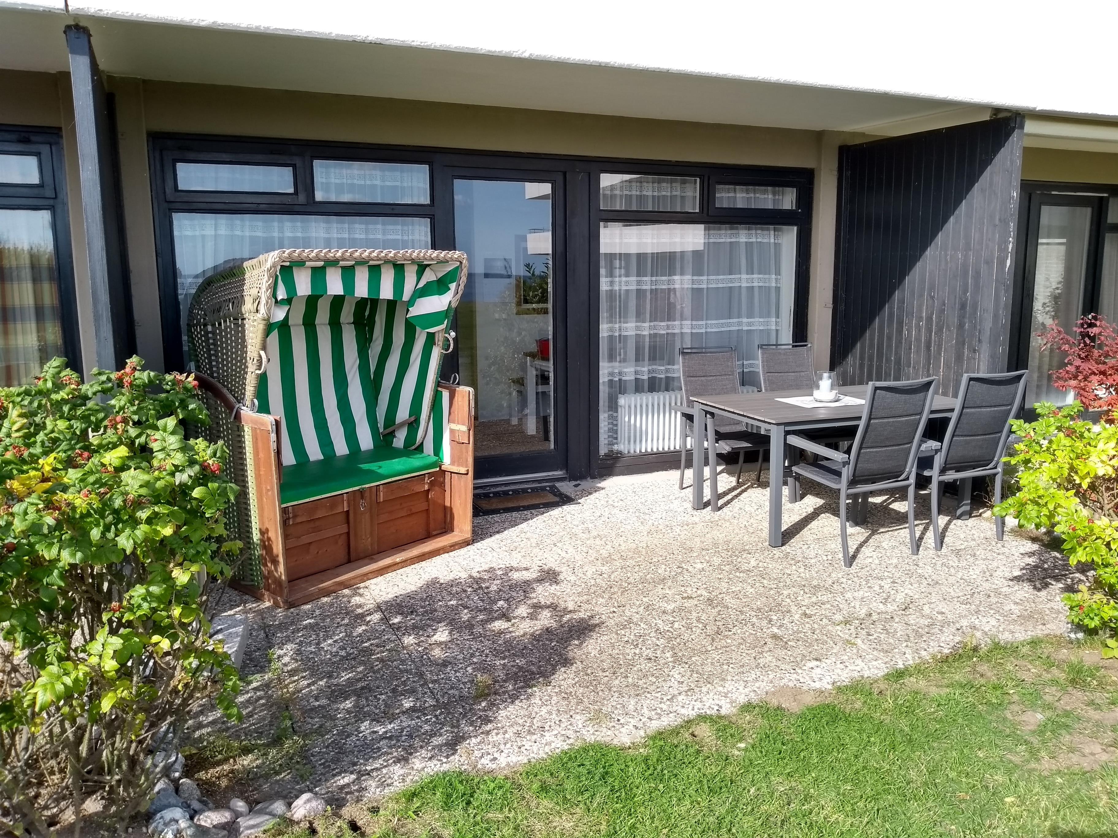 Auf der Terrasse befindet sich ein großer Gartentisch mit vier Stühlen und einem Strandkorb.