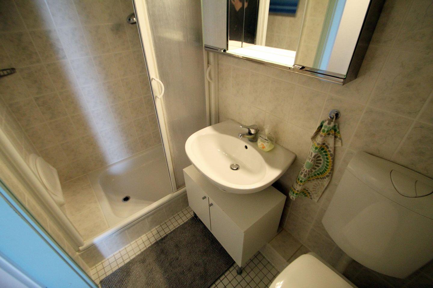 Das zweckmäßige Duschbad ist mit fester Duschwand, Steckdosen, klappbarem Duschsitz und beleuchtetem Spiegelschrank ausgestattet.