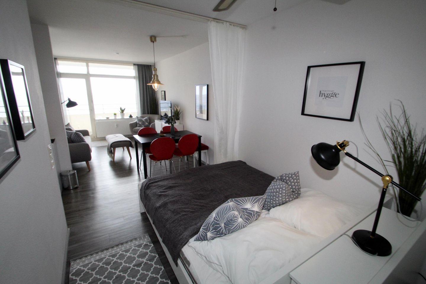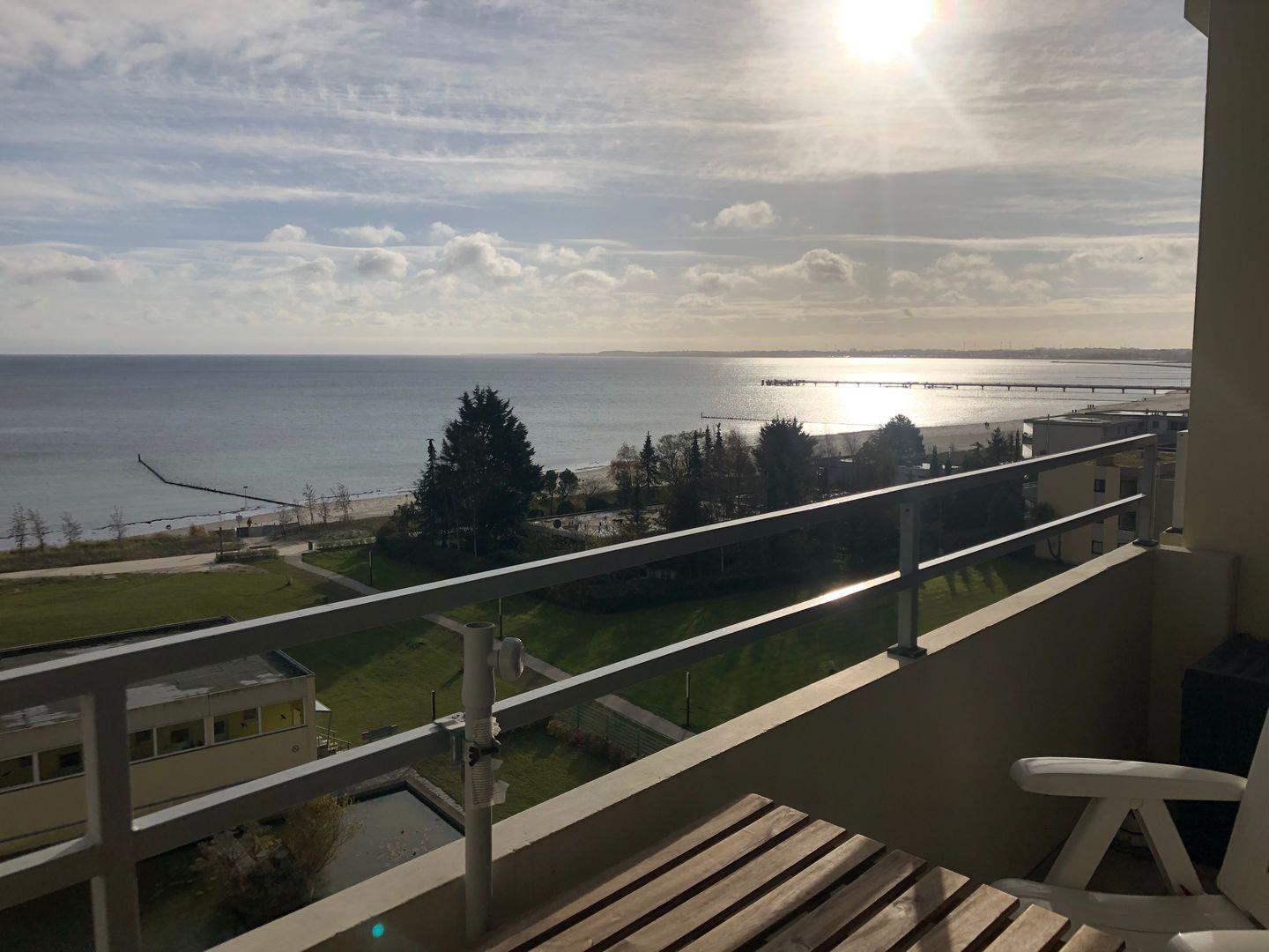 Der möblierte Südbalkon schenkt Ihnen einen unverbauten Frontalblick auf das Meer und verwöhnt Sie mit extra vielen Sonnenstunden. Ob zum Frühstück oder zum Kaffee am späten Nachmittag: Hier genießen Sie die Sonne und die Aussicht auf die glitzernde Ostsee aus dem 7. Stockwerk fast den ganzen Tag. Vom separaten Schlafzimmer schauen Sie ebenfalls direkt auf das Meer. Eine Musikanlage und ein Wäscheschrank gehören in diesem Raum zur weiteren Ausstattung.