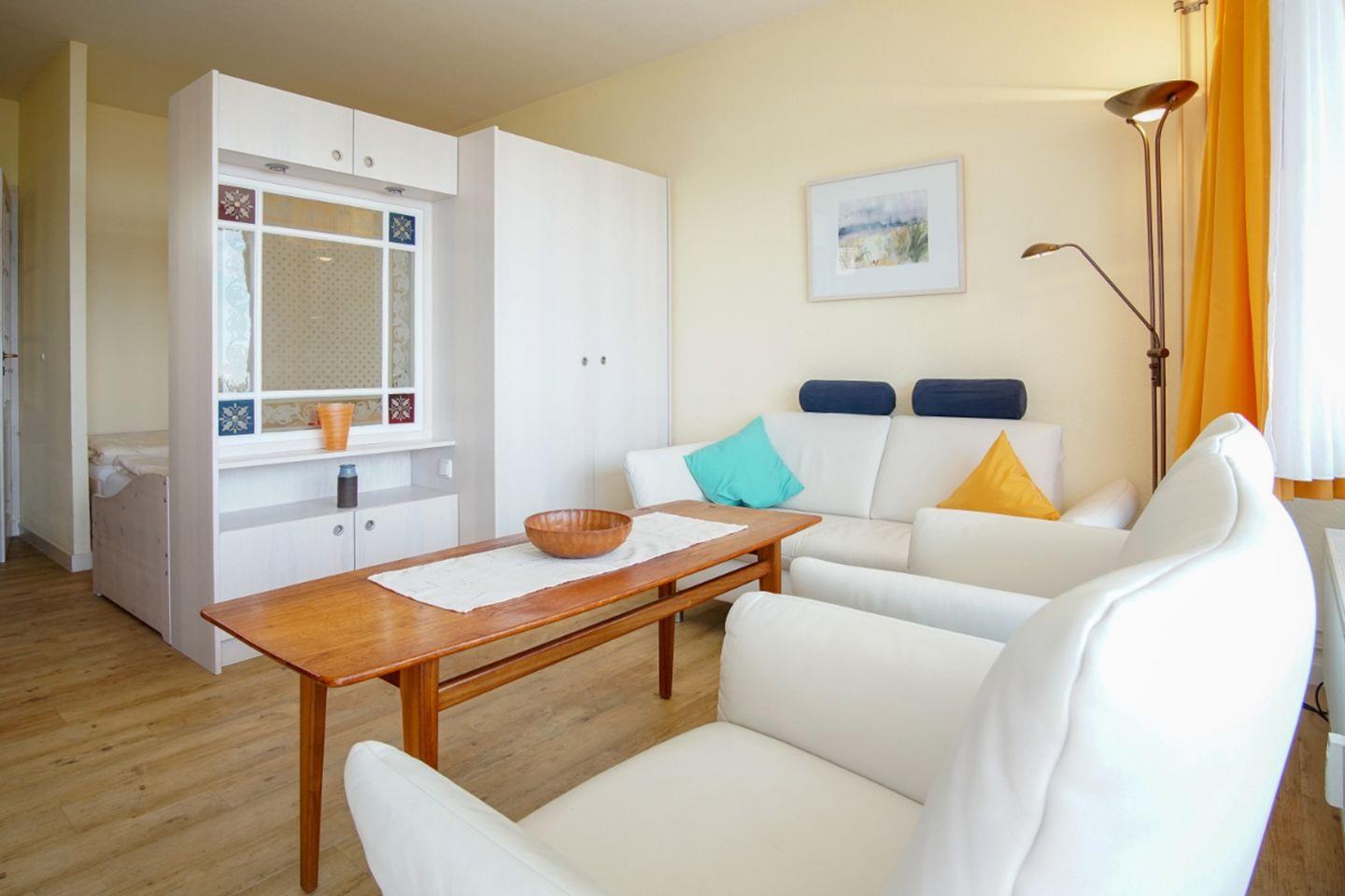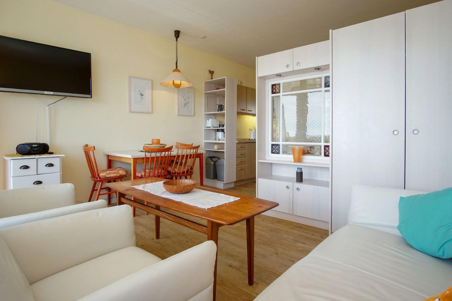 Auf der bequemen Couch und den zwei Sesseln haben Sie reichlich Platz, um gemütliche Abende zu verbringen. Hier ist auch der Kleiderschrank zum Schlafzimmer untergebracht. Gegenüber ist der Fernseher an der Wand befestigt und auch ein kleiner CD-Player findet sich dort.