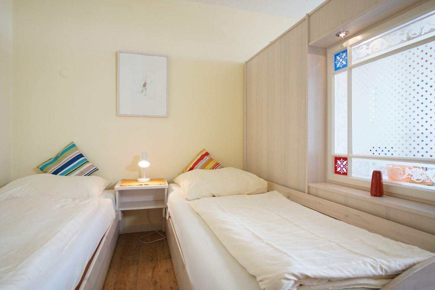Das an den Wohn- Essraum angrenzende offene Schlafzimmer verfügt über zwei einzelne Betten, die unterschiedlich lang sind. Ein Fenster zum Wohnraum bringt etwas Tageslicht in diesen Raum.