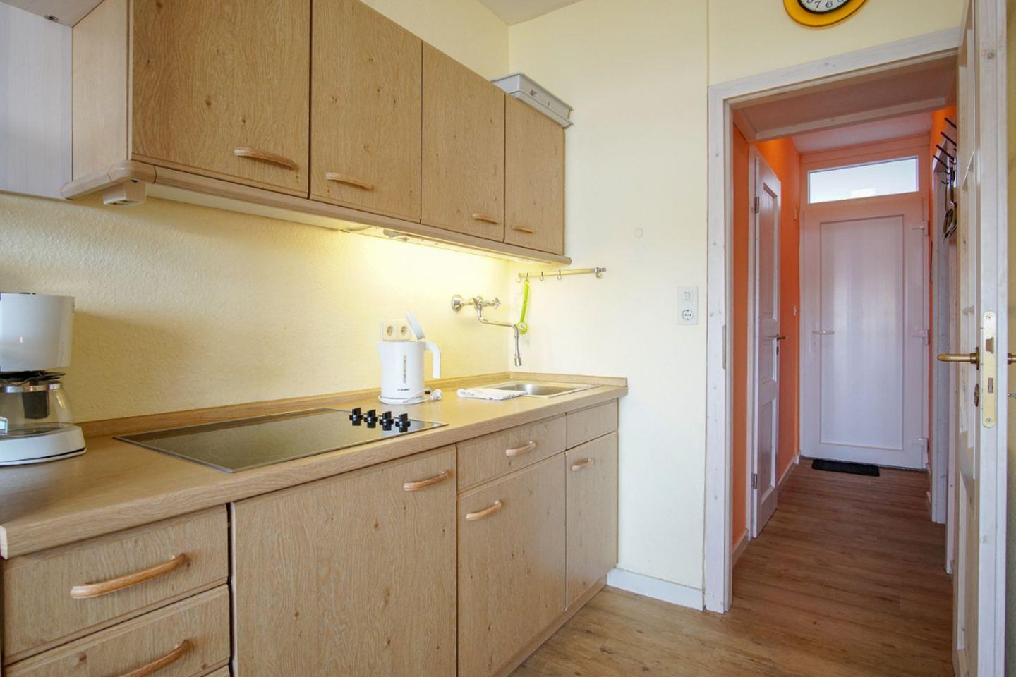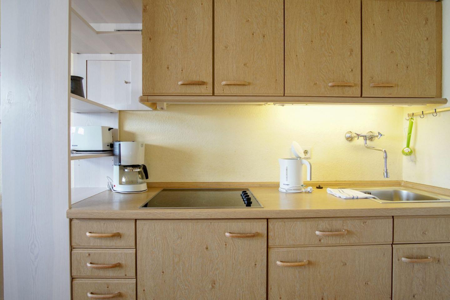 In dem kleinen Raumteiler-Regal sind einige Küchengeräte untergebracht. Hinter dem Raumteiler befindet sich die Küchenzeile. Hier finden Sie u. a. einen Herd mit Ceranfeld und einen Kühlschrank, der über ein integriertes Gefrierfach verfügt. Wasserkocher, Kaffeemaschine und Toaster sind selbstverständlich, ebenso wie ausreichend Geschirr, Besteck und sonstige Küchenutensilien, vorhanden.