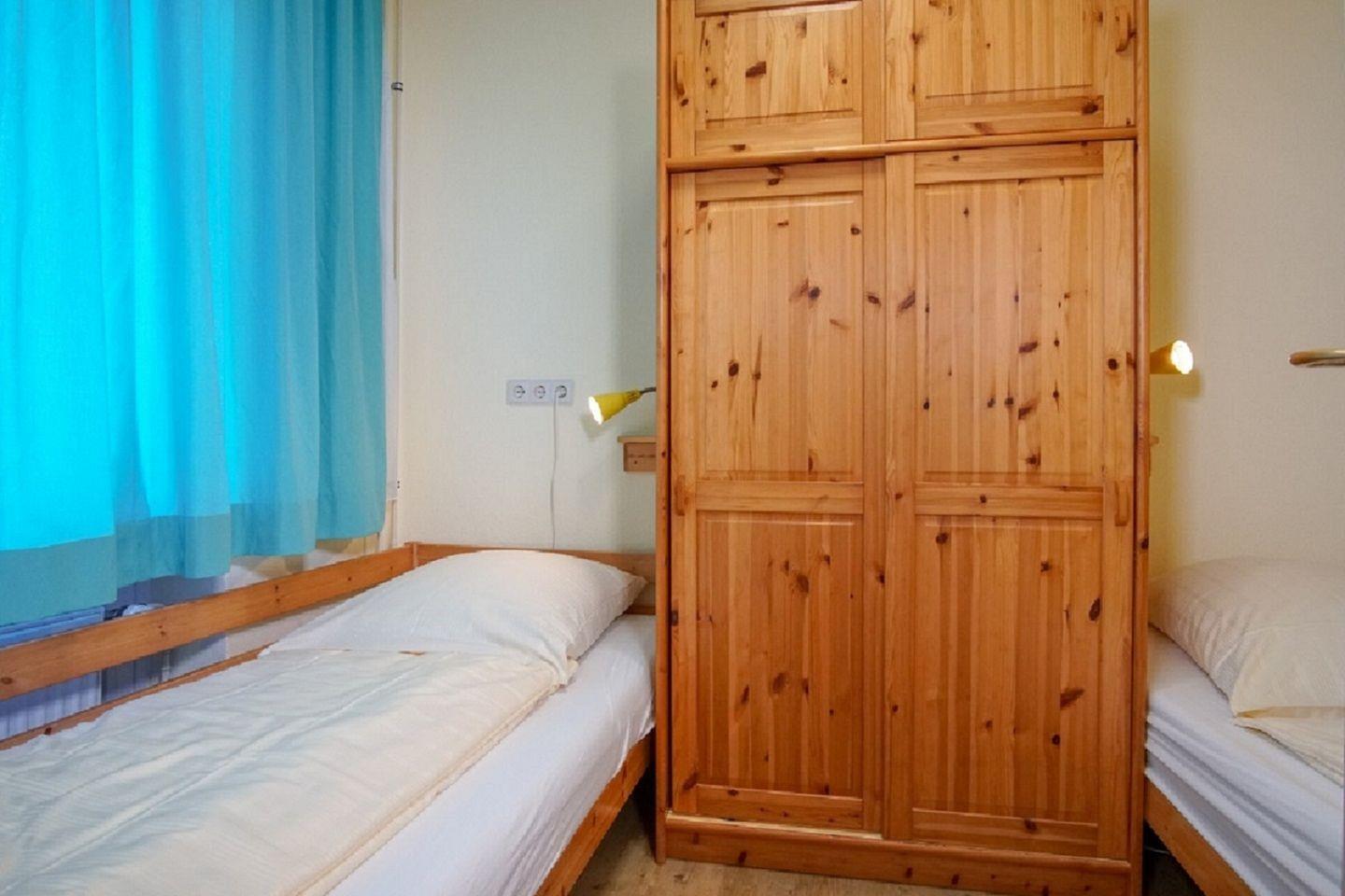 Das zweite Schlafzimmer ist ebenfalls mit zwei einzelnen Betten ausgestattet und verfügt darüber hinaus über einen schmalen Kleiderschrank an dessen Außenwänden Leselampen angebracht sind. Auch Ablagen für Wecker oder ein Buch fehlen nicht.