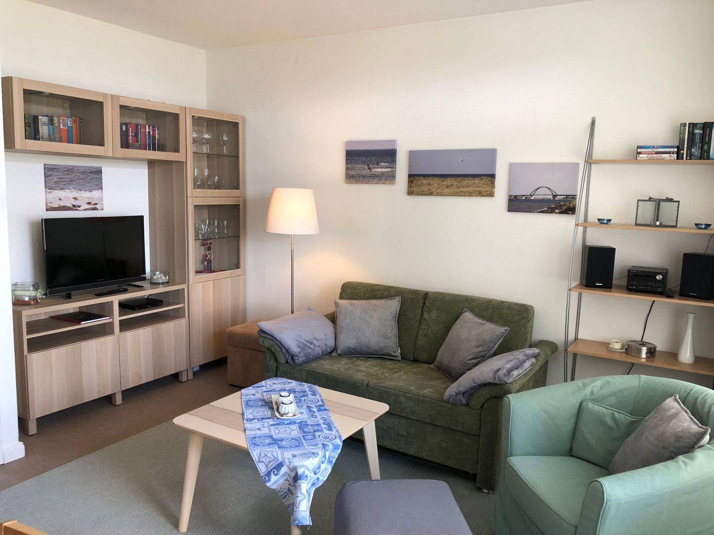 Im Wohnzimmer finden Sie einen Esstisch für 3 Personen, ein ausziehbares Sofa (Liegefläche 120*200 cm), einen gemütlichen Sessel, einen Couchtisch sowie einen Wohnzimmerschrank vor. Der helle Wohnbereich kann mit Plissees sowie zusätzlich mit elektrischen Außenjalousien komplett verdunkelt werden. Zu Ihrer Unterhaltung stehen Flachbildfernseher (32 Zoll), Musikkompaktanlage, Video/DVD-Player, WLAN-Zugang über Fritzbox, verschiedene Gesellschaftsspiele sowie Bücher bereit.