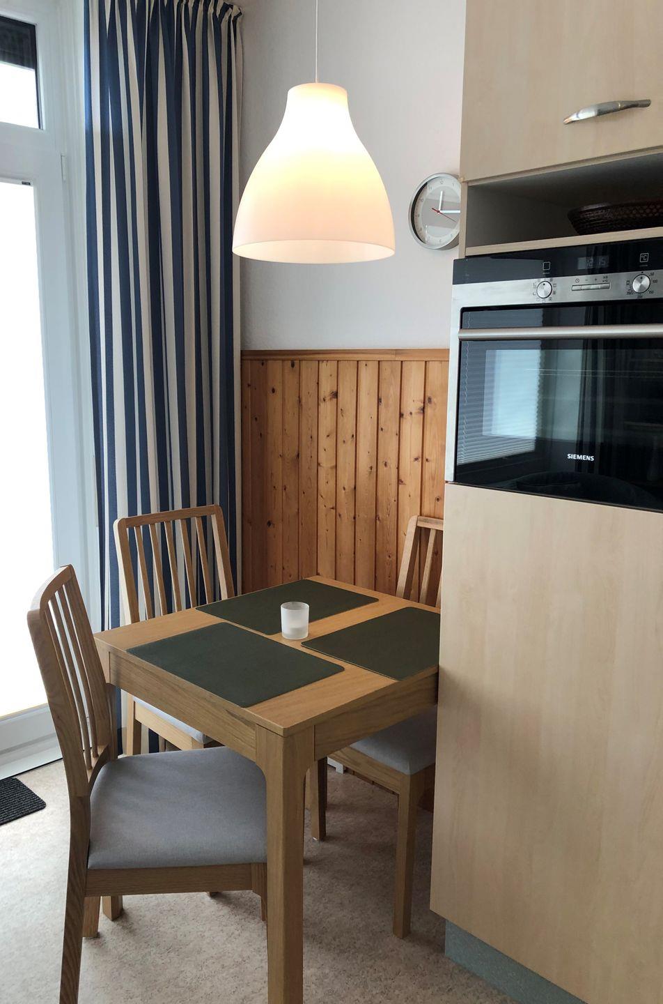 Die kleine Einbauküche im Wohnbereich ist mit Kühlschrank, Spülmaschine, Backofen, Mikrowelle, Kaffeemaschine, Wasserkocher, Toaster, Eierkocher, Mixer und Stabmixer umfassend auch für einen längeren Aufenthalt ausgestattet.