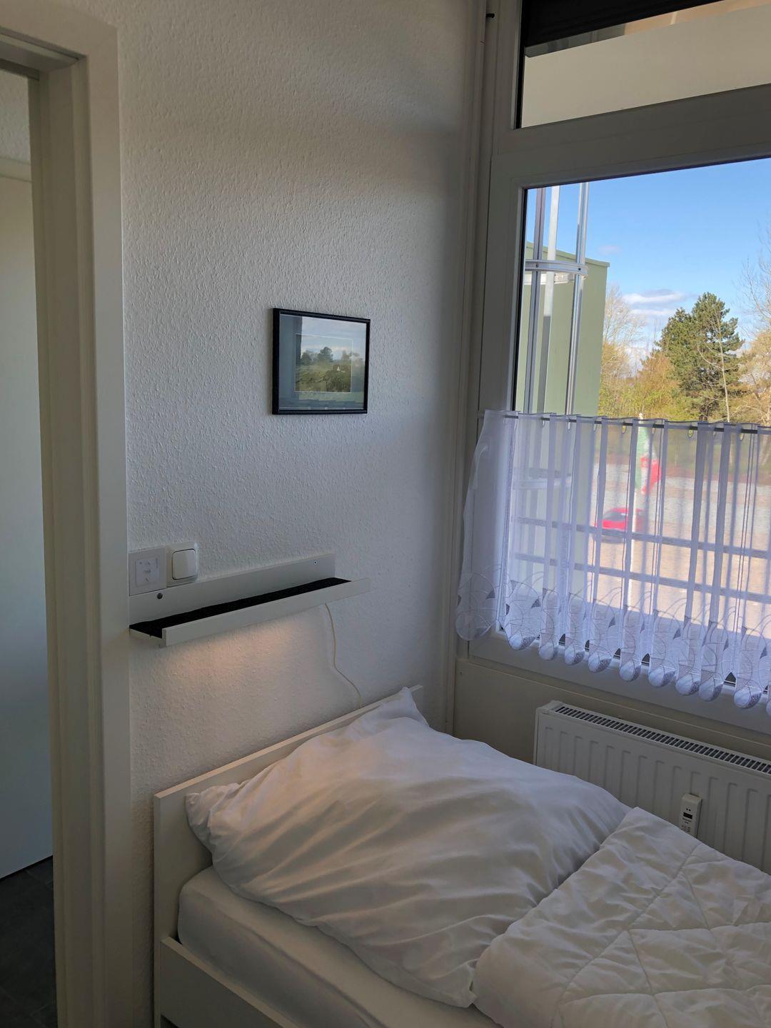 Im hellen, 2021 renovierten Schlafzimmer stehen Ihnen zwei Einzelbetten (80*190 cm & 90*190 cm) über Eck sowie ein Einbau-Kleiderschrank zur Verfügung. Durch die Eck-Lage der Wohnung bietet das Schlafzimmer gleich 2 große Fenster welche mit Verdunklungsvorhängen, Außenjalousie und Plissee ausgestattet sind. Die modernen Leselampen an den Betthäuptern sind in verschiedenen Helligkeiten einstellbar.
