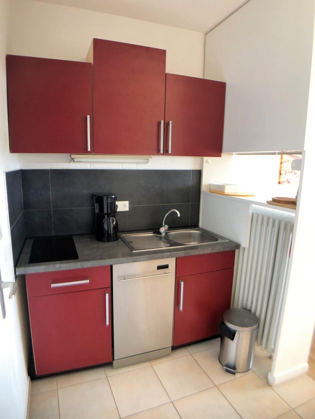 Am Essplatz finden vier Personen gemütlich Platz um entspannte Abende bei einem leckeren Essen oder guten Gesprächen zu verbringen. In der angrenzenden kompakten Einbauküche stehen ein Herd mit zwei Kochfeldern, Spüle und Geschirrspüler bereit. Im gegenüberliegenden Abstellraum finden Sie Kühlschrank, Microwelle, Wasserkocher, Toaster und weiteren Stauraum.