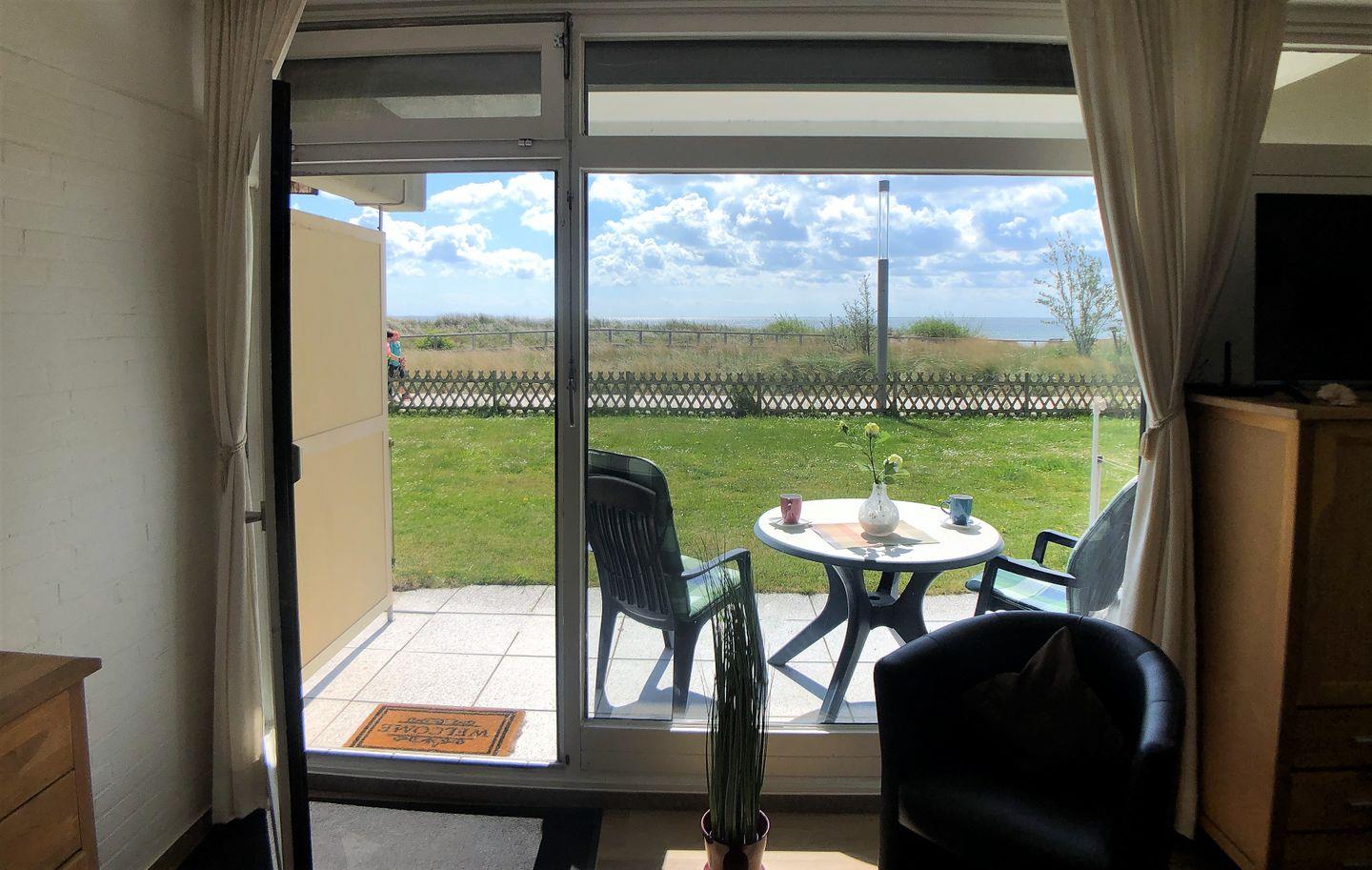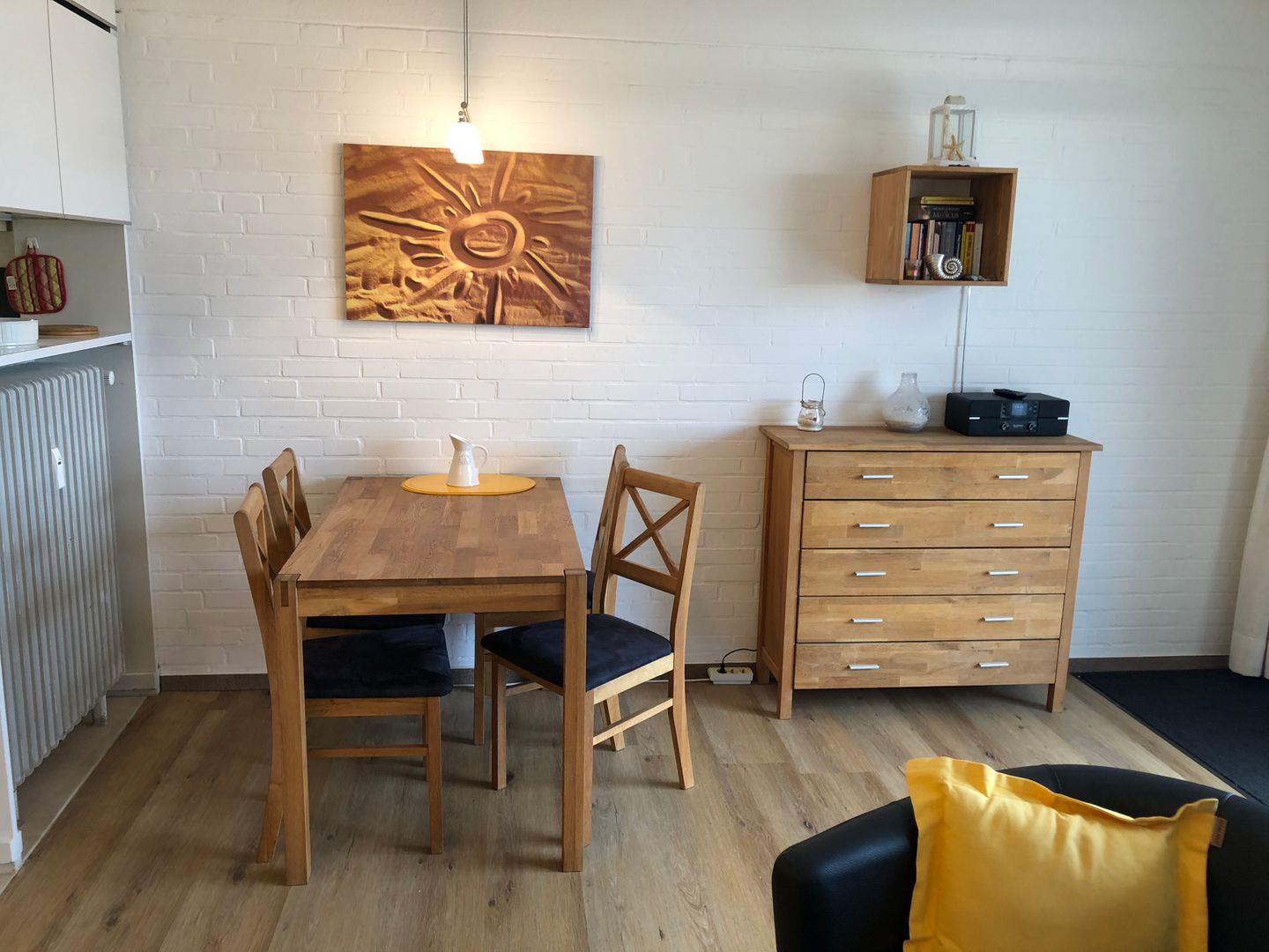 Der Wohnbereich ist mit einem neuen Schlafsofa (Liegefläche 140*195 cm), zwei Sesseln, großem Fernseher (39 Zoll), einem kleinen Kleider-/ und Wäscheschrank sowie einer Kommode ausgestattet. Die große Fensterfront mit elektrischen Außenjalousien schenkt einen herrlichen Ausblick auf Promenade, Dünen und Meer.