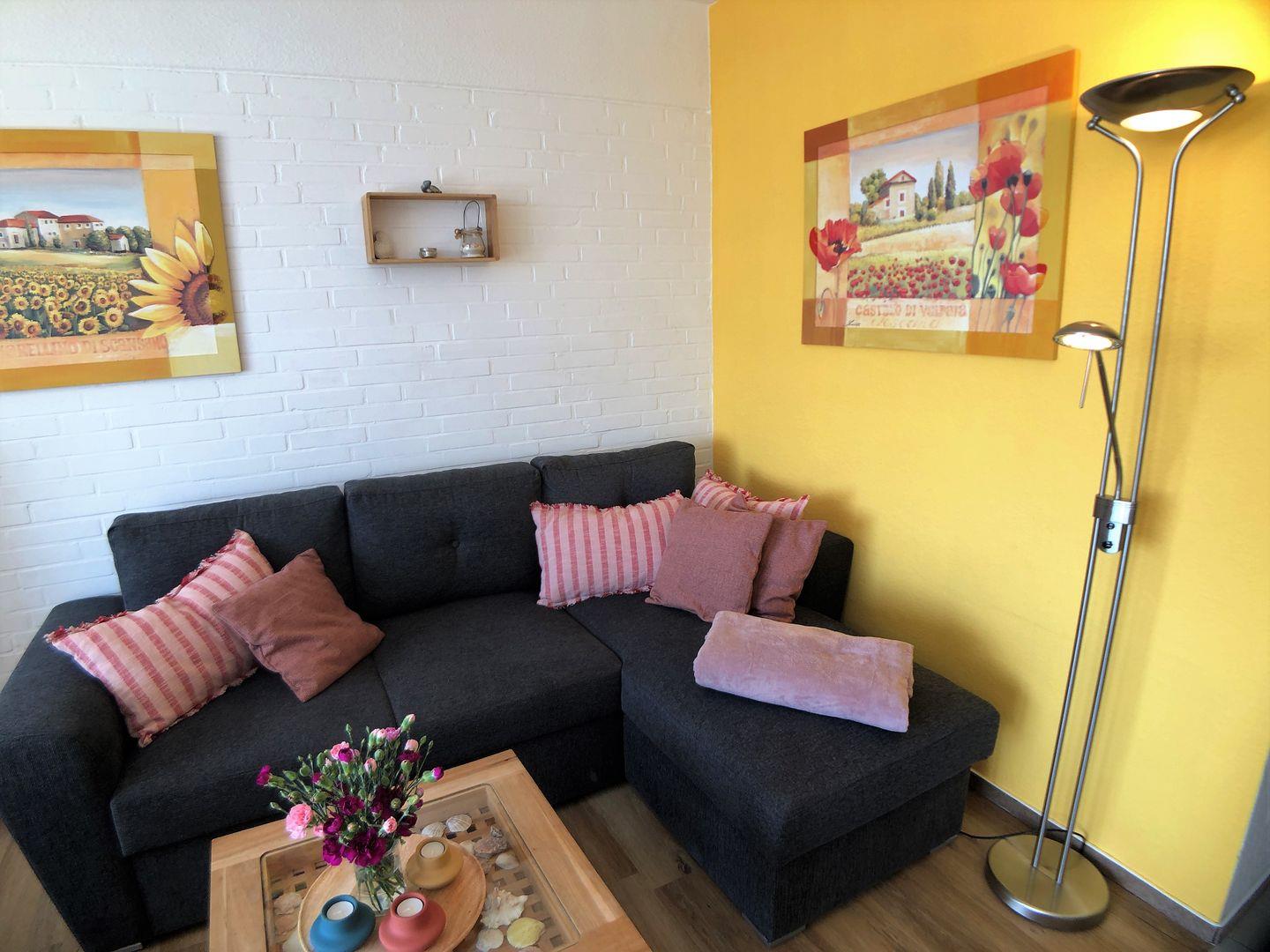 Die in warmen Farben eingerichtete 38qm große Wohnung für bis zu 4 Ostseeurlauber besteht aus Flur, kleinem Duschbad, separatem Schlafzimmer, Abstellraum und Wohnzimmer mit Küchenzeile.