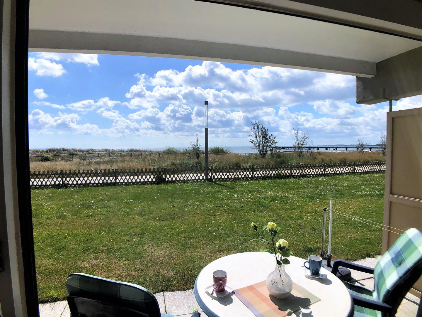 Vom Wohnbereich gelangen sie auf die möblierte Terrasse: Aufgrund der Südlage genießen Sie hier von morgens bis frühabends zahlreiche Sonnenstunden, beobachten die Flanierenden auf der neuen Promenade die hinter der Rasenfläche der Häuser Bellevue beginnt und sehen, hören, schmecken und riechen die wunderbare, glitzernde Ostsee.