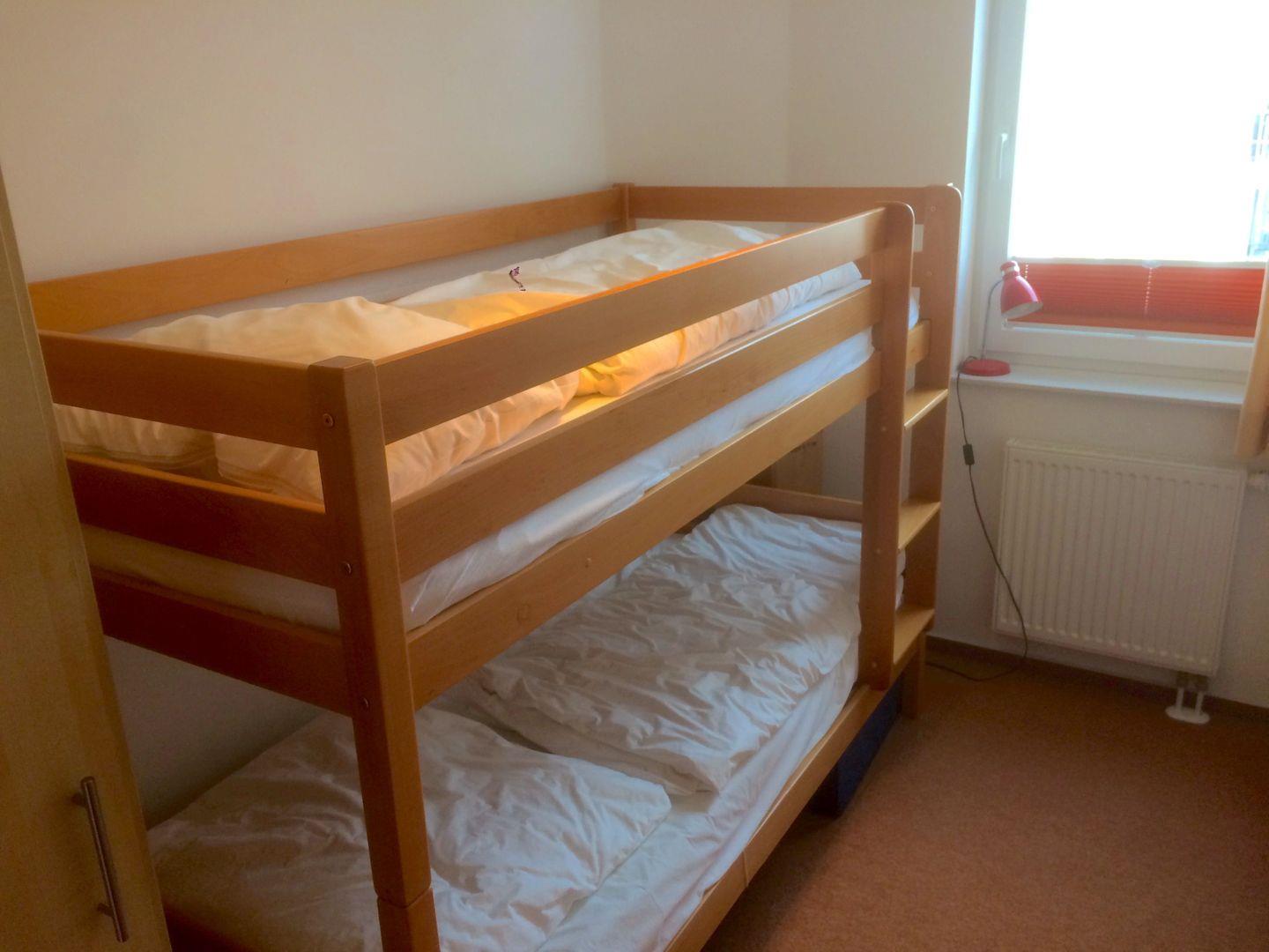 Im ersten Schlafzimmer finden bis zu zwei Gäste im Etagenbett (je 90*200cm) eine entspannendes Nachtlager. Ein Schrank für Ihren Kofferinhalt steht hier ebenfalls bereit.