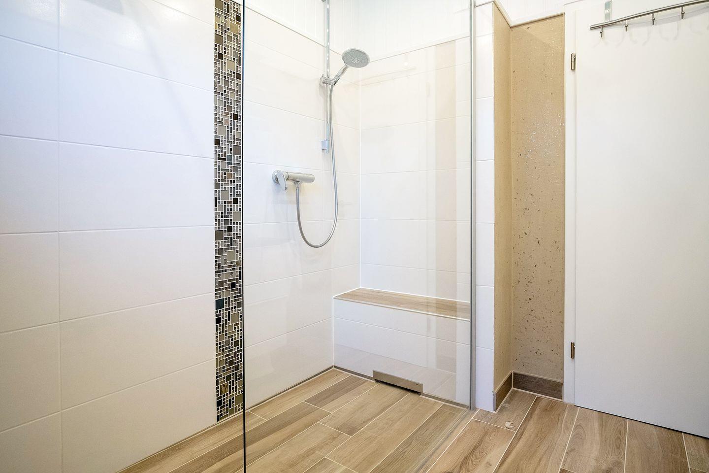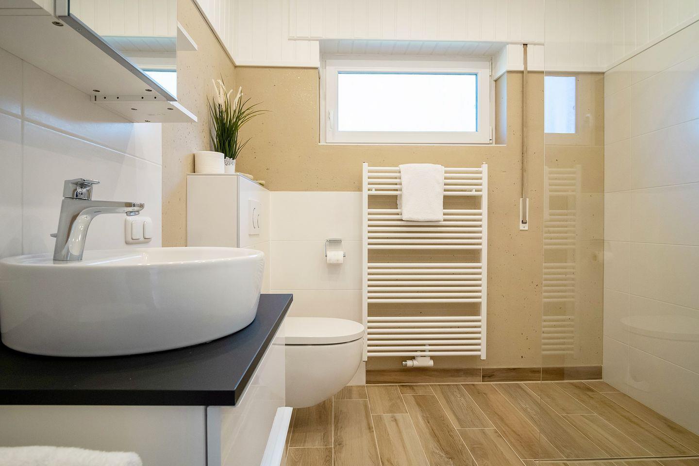 Die zwei Badezimmer mit Fenster bieten eine Dusche mit niedrigem Einstieg, Waschbecken mit Spiegel und einem Handtuchheizkörper, auch hier ist ausreichend Platz für 6 Personen.