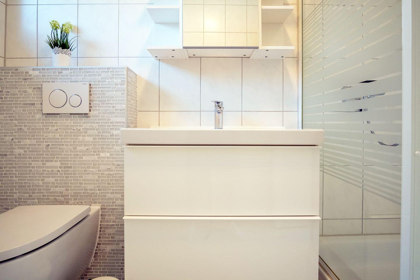 Eine Fußbodenheizung im großen Badezimmer sorgt für wohlig warme Füße.