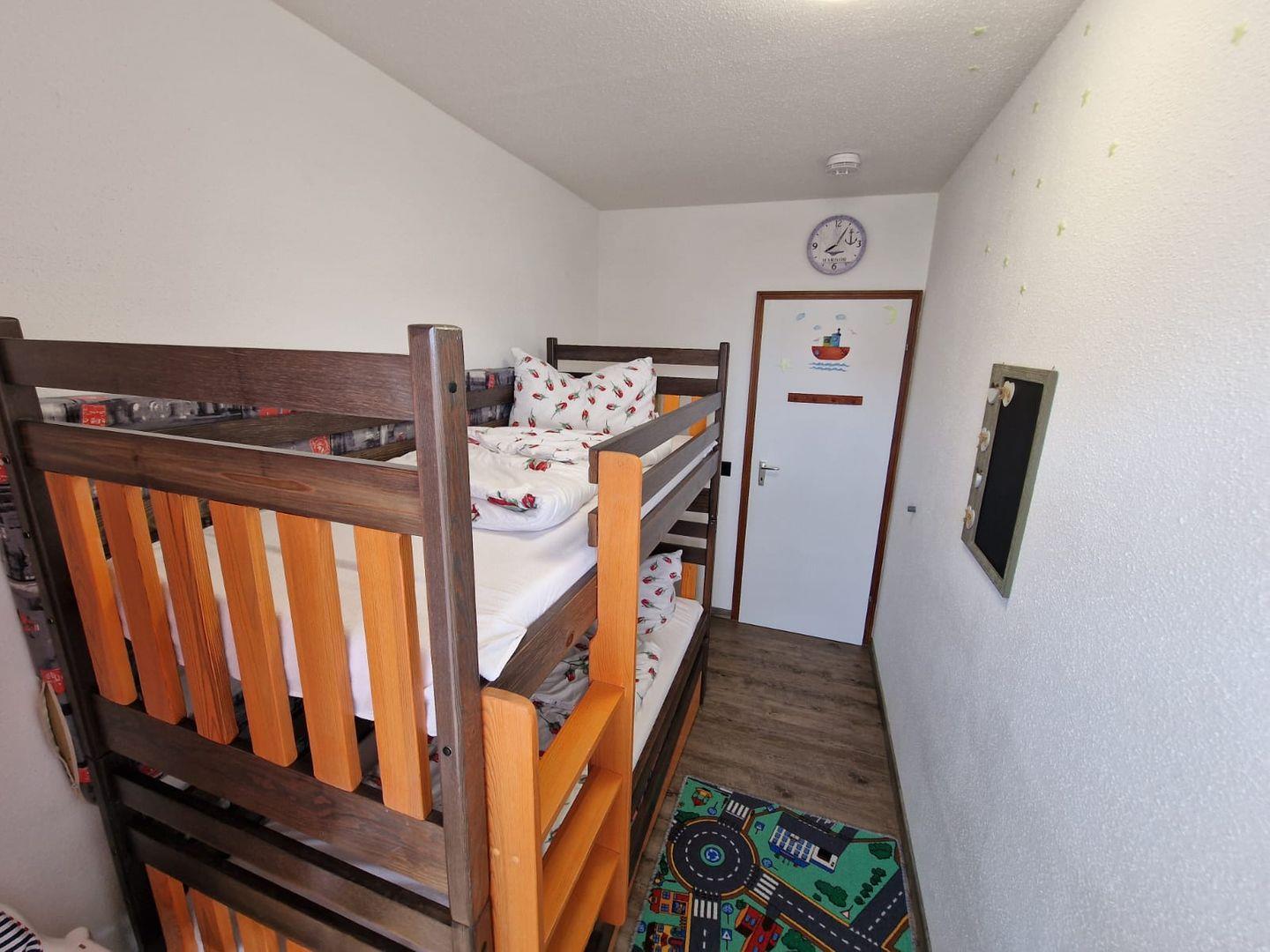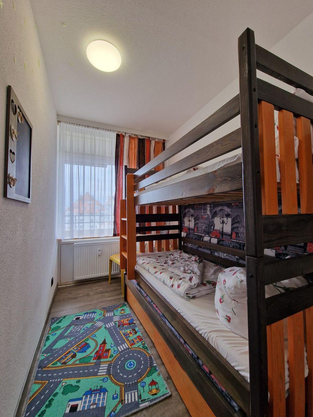 Im separaten Kinderzimmer steht ein Etagenbett für 2 junge Gäste bereit. Eine kleine Sitzecke für die Kids, ein Regalsystem und eine kinderfreundliche Gestaltung komplettiert die Einrichtung. Das innenliegende Duschbad bietet eine sehr geräumige moderne Dusche, WC und einen beleuchteten Spiegel.
