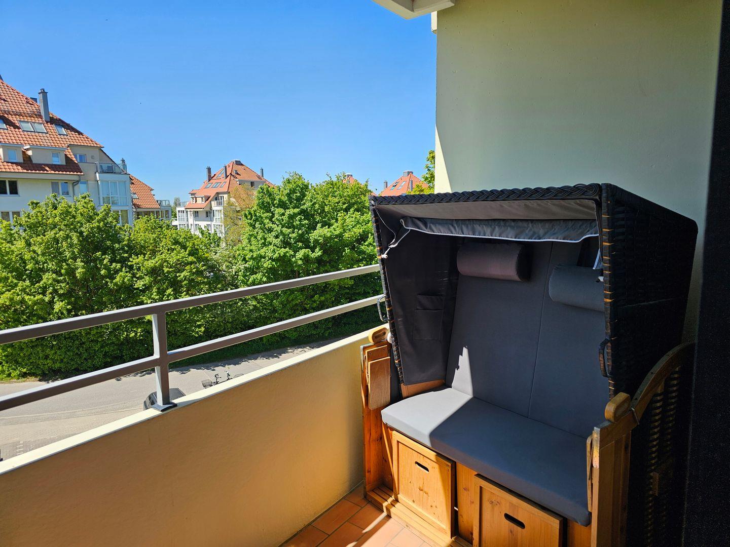 Highlight: Auf dem Balkon steht den Gästen ein schicker Strandkorb sowie Balkonmöbel zur Verfügung. Lauschen Sie dem herrlichen Meeresrauschen und sollte Ihnen die Sonne zu stark brennen, so können Sie die Markise zu Ihrem Schutz ausfahren.