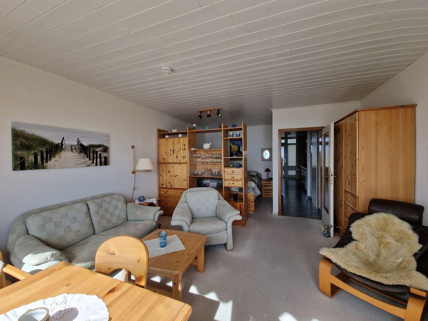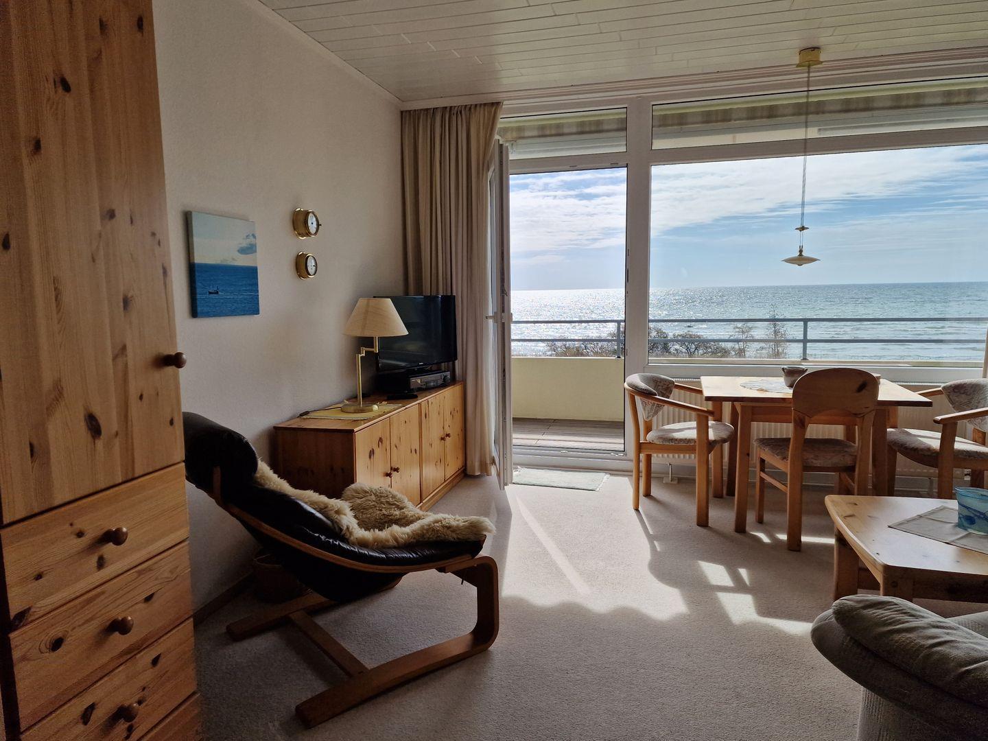 Durch die besondere Lage verfügt die helle Wohnung im 2. Stock über eine große Fensterfront in südlicher Ausrichtung. In erster Baureihe am Strand haben Sie von hier einen unverbauten, fantastischen Meerblick und zu jeder Tageszeit die Möglichkeit ein sonniges und geschütztes Plätzchen zum Entspannen zu finden. Der Balkon ist umfassend möbliert: Hochlehner mit Auflagen und ein großer Tisch unter der Markise laden Sie ein, Ihren Aufenthalt bei schönstem Wetter draußen zu genießen.