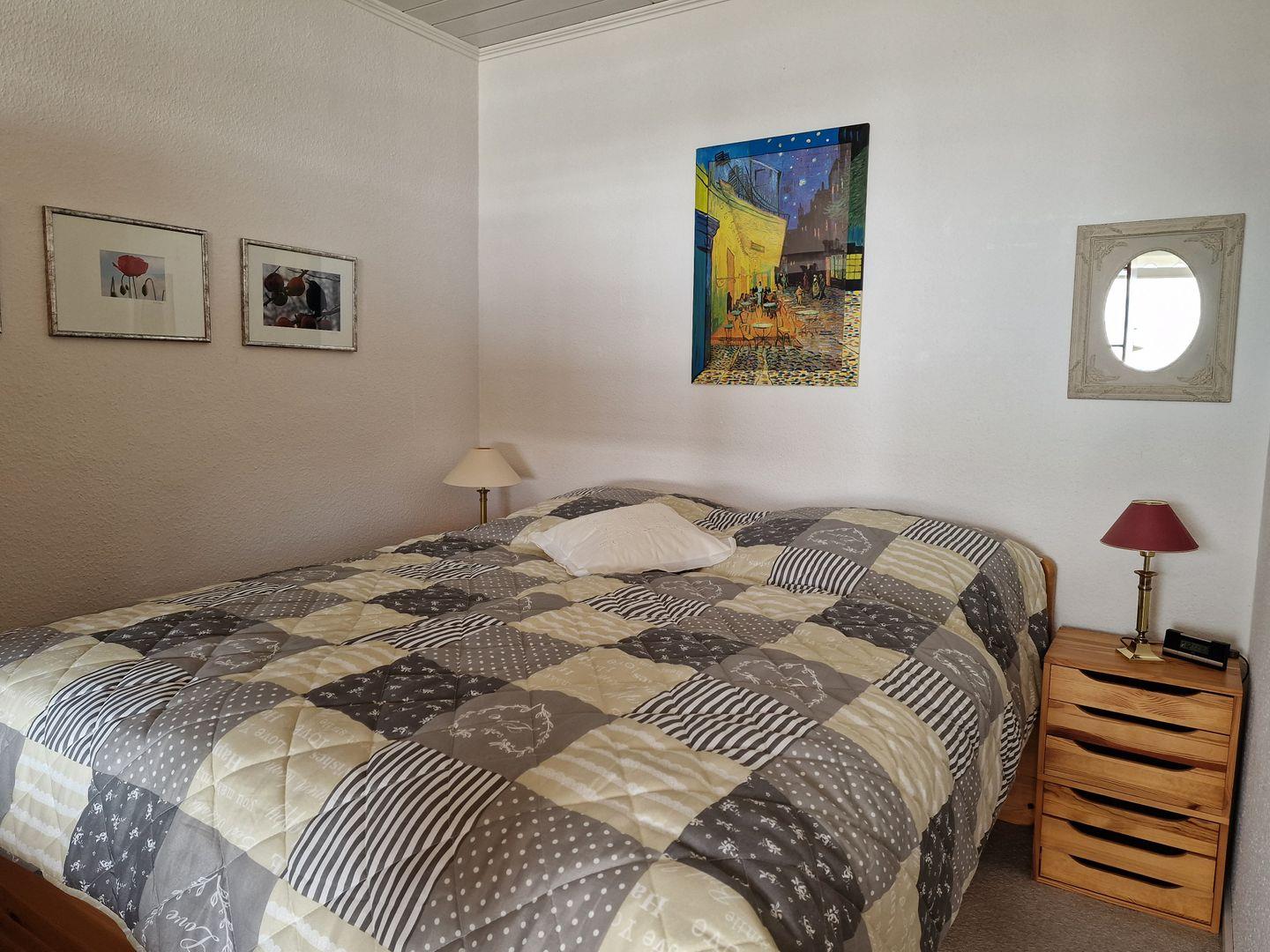 In dem vom Wohnzimmer durch eine Schrankwand abgetrennten Schlafzimmer steht Ihnen ein Doppelbett (2*80*200cm), Nachttische und Leselampen an den Bettseiten zur Verfügung. Weitere Staumöglichkeiten bietet der große Einbauschrank im Wohnbereich.