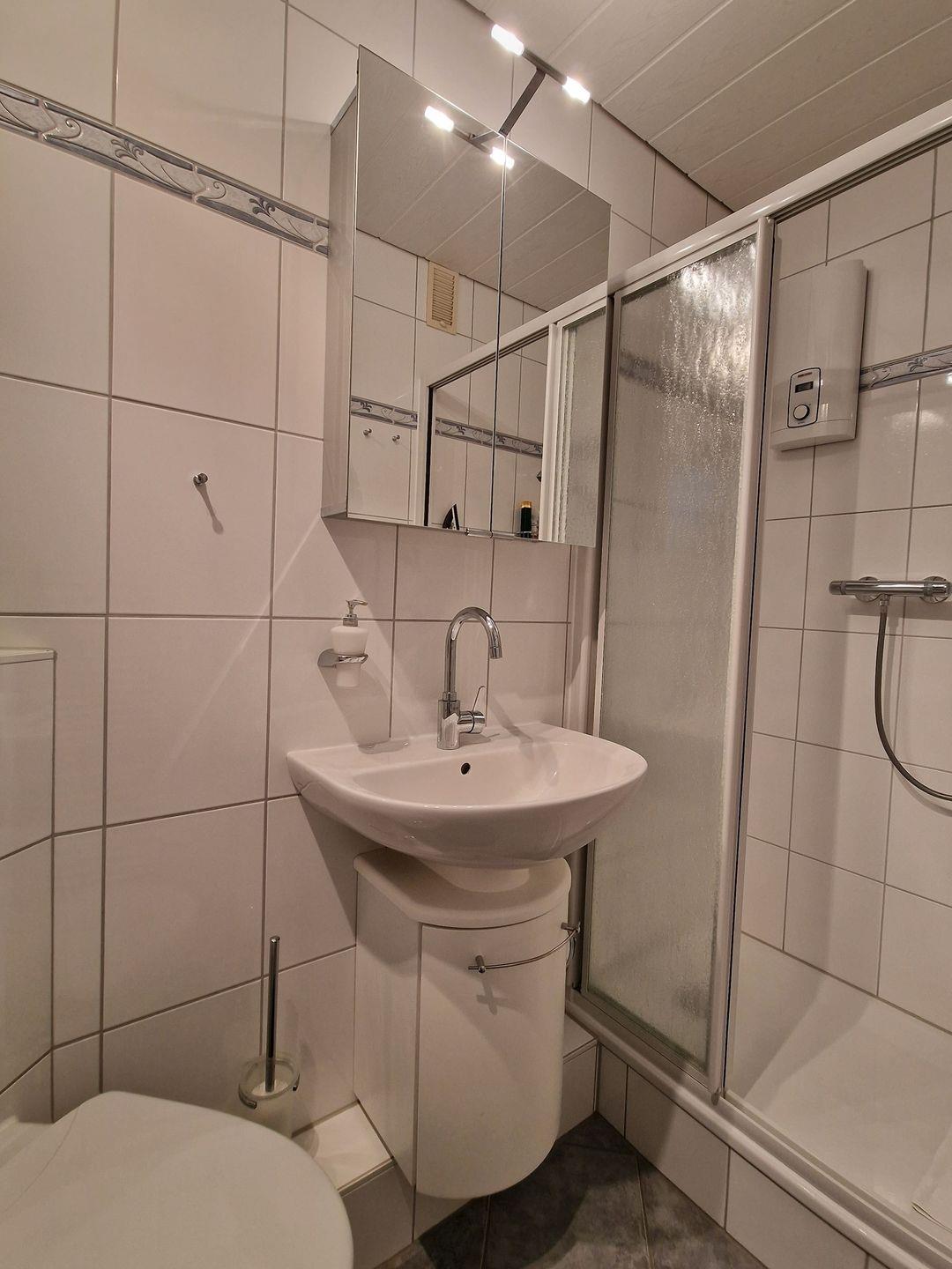 Das innenliegende Duschbad verfügt über einen Handtuchheizkörper, WC, Dusche mit Schiebetüren, einen großen beleuchteten Spiegelschrank und Verstau- und Ablageflächen.