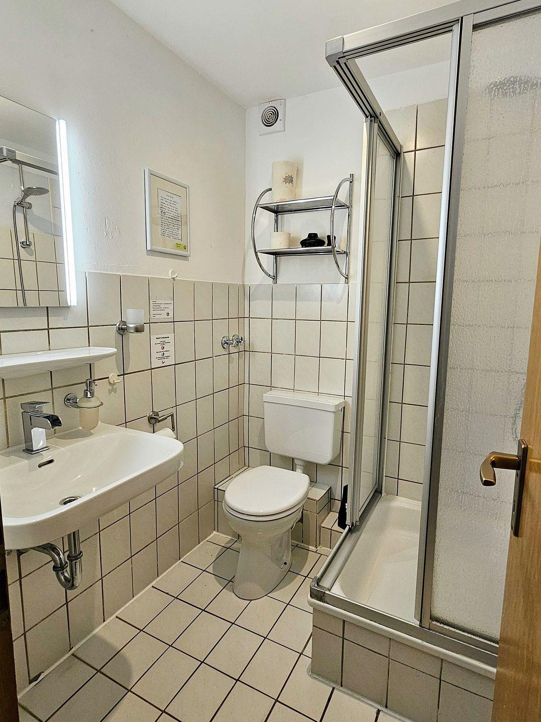 Im funktionalen, innenliegenden Duschbad wurde eine Duschwanne mit hohem Einstieg, ein Regal mit Ablagemöglichkeiten und ein beleuchteter Spiegel verbaut.