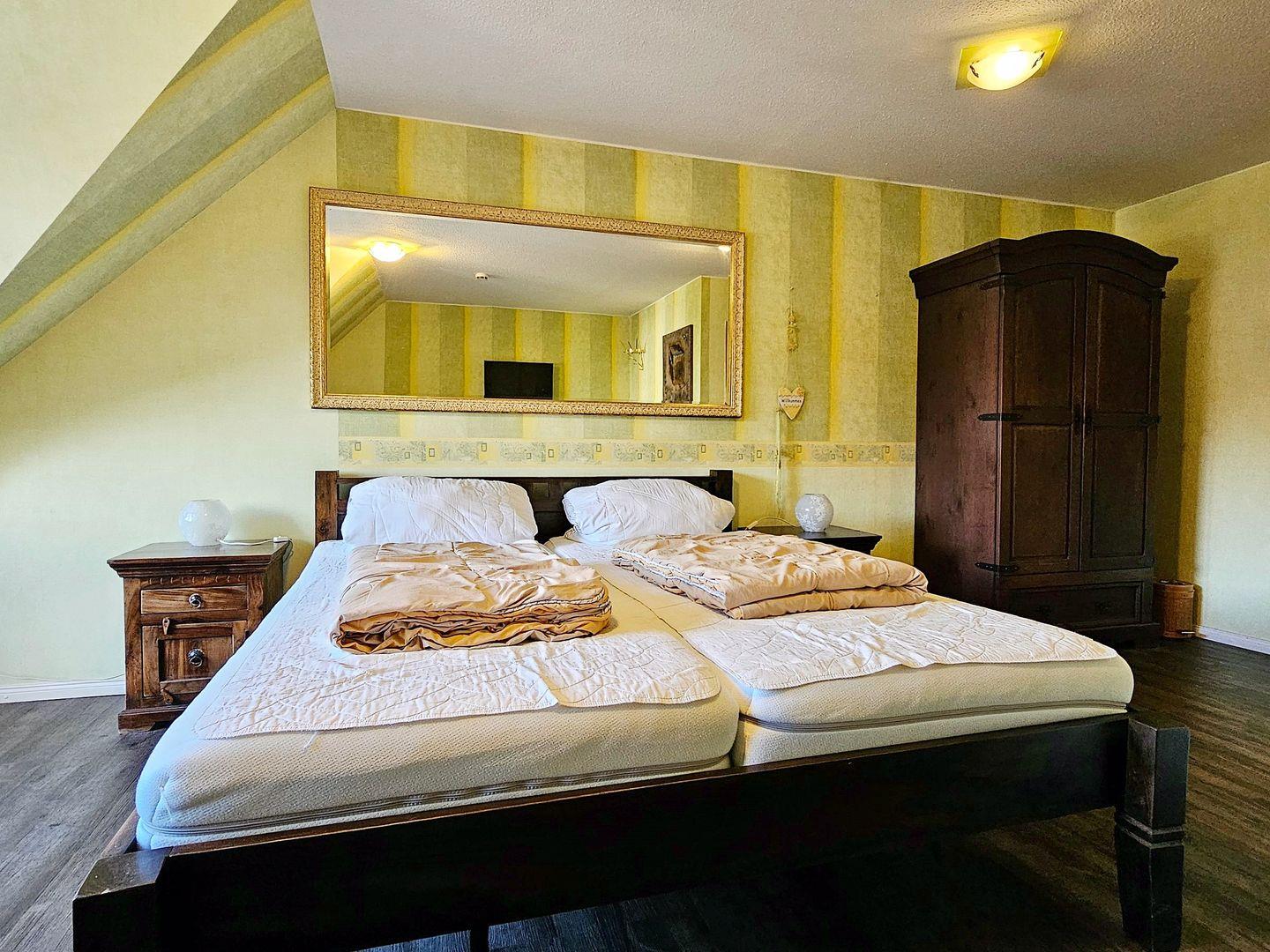 In diesem hellem eingerichteten Zimmer befindet sich ein Doppelbett sowie eine kleine Sitzgruppe mit Beistelltisch. Ein großer Kleiderschrank bietet gute Verstaumöglichkeiten für ihre Urlaubsgarderobe und an dem zusätzlichen Esstisch können Sie Ihre weiteren Unternehmungen planen.