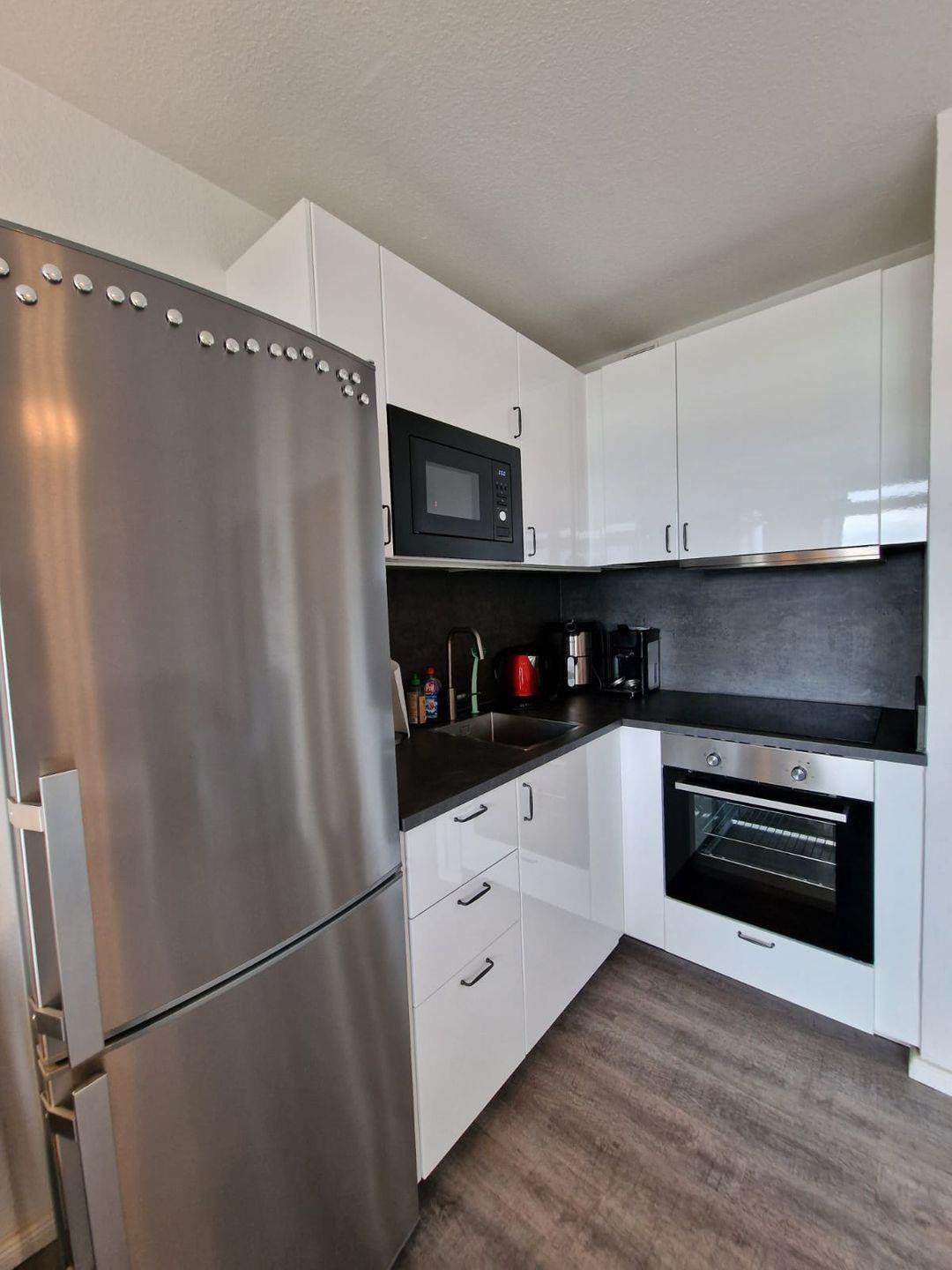 In der hochwertigen Einbauküche finden Sie jede Menge Stauraum für Lebensmittel, einen Backofen, eine Mikrowelle, ein Kochfeld mit integrierter Dunstabzugshaube, eine Heißluftfriteuse sowie umfassende Ausstattung zum Kochen und anschließendem Genießen.