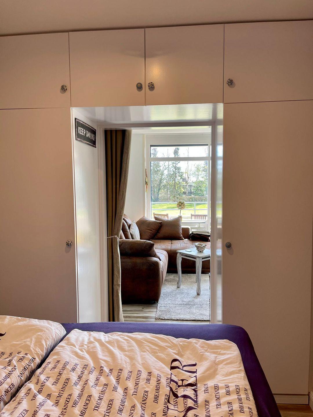 Im Schlafbereich steht ein hochwertiges Boxspringbett von 160 x 200 für entspannte Urlaubsnächte bereit. Der Raum verfügt über einen geräumigen Einbauschrank und Sie können hier so problemlos ihre Urlaubsgarderobe verstauen. Die Abtrennung zum Wohnbereich kann optisch mit einem Vorhang vorgenommen werden.