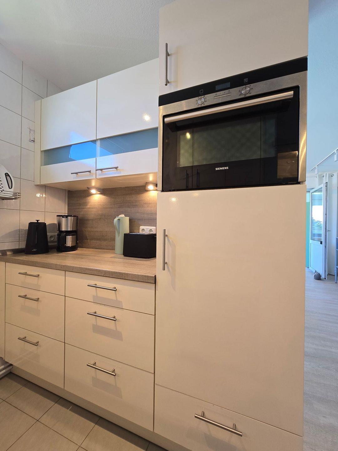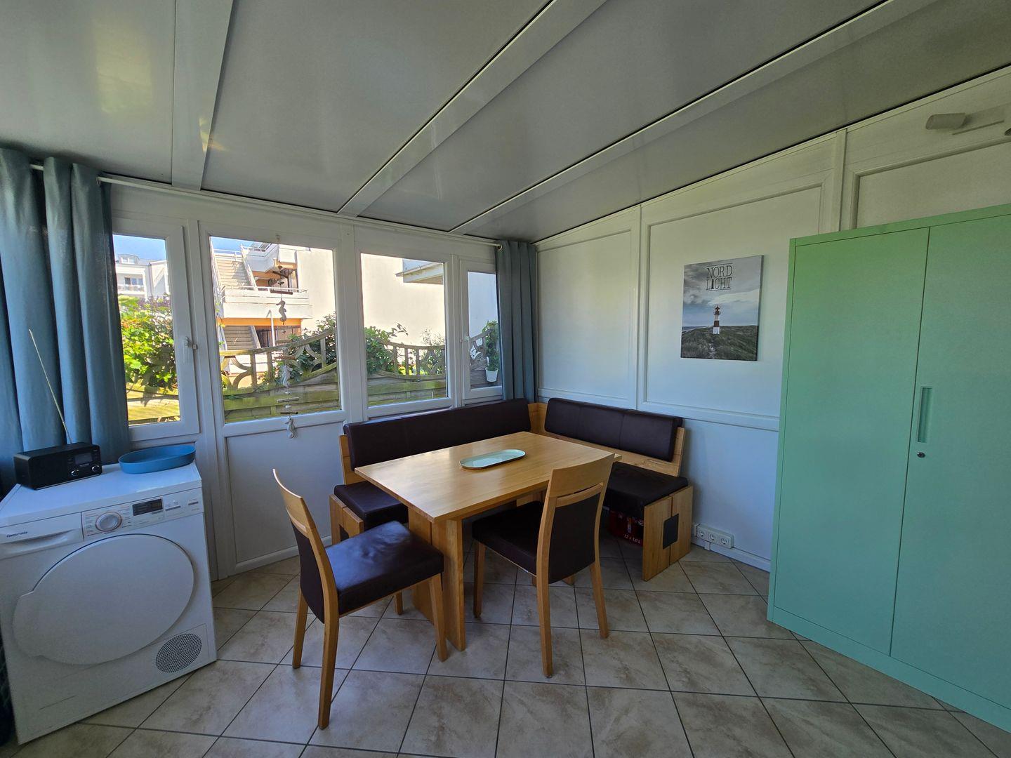 Die offene Küche ist modern ausgestattet und lässt keine Wünsche offen. Hier finden Sie einen 4er Induktionsfeld mit Backofen, Kühlschrank mit Gefrierfach, Spülmaschine, Kaffeemaschine, Toaster, Wasserkocher sowie sämtliches Geschirr, Besteck und Küchenutensilien, die Sie für einen angenehmen Aufenthalt benötigen. Für ein gemeinsames Frühstück oder Abendessen bietet der Essbereich im Wintergarten (mit Fussbodenheizung) ausreichend Platz.