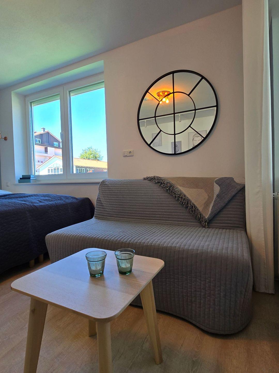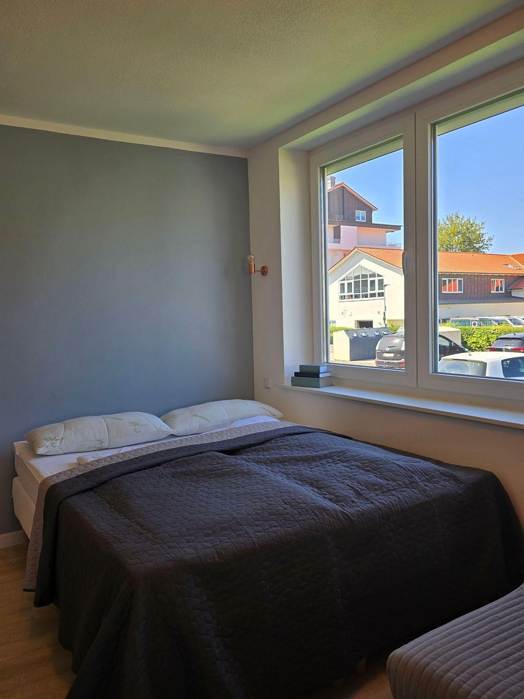 Die lichtdurchflutete Wohnung befindet sich im Erdgeschoss und ist besonders für Paare, Familien und auch Gäste mit Hund geeignet. Maximal fünf Schlafmöglichkeiten stehen zur Verfügung. Das Schlafzimmer ist funktional eingerichtet und wird durch den gemütlichen Wohn- und Essbereich ergänzt, der mit einem Sofa, Kommoden und TV zum Entspannen einlädt. Für geruhsame Nächte stehen Ihnen Boxspringbetten zu Verfügung.