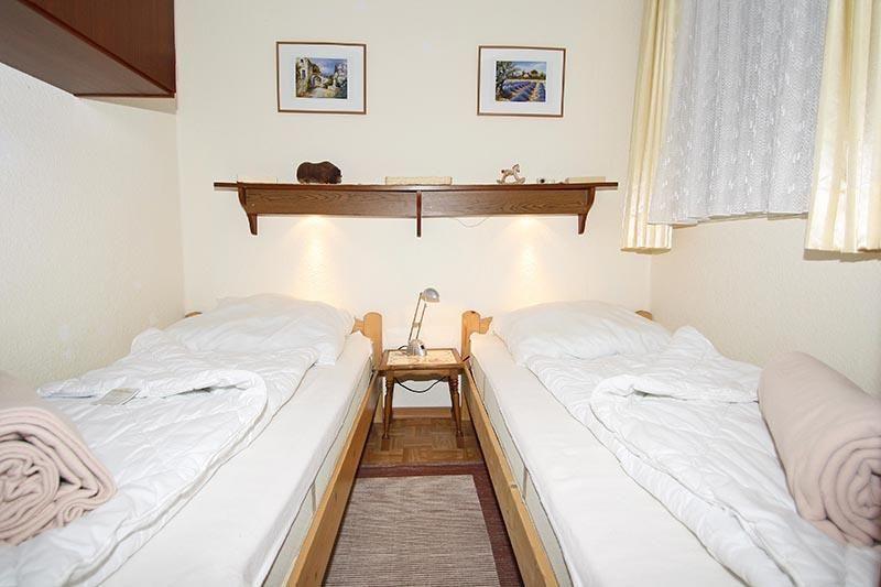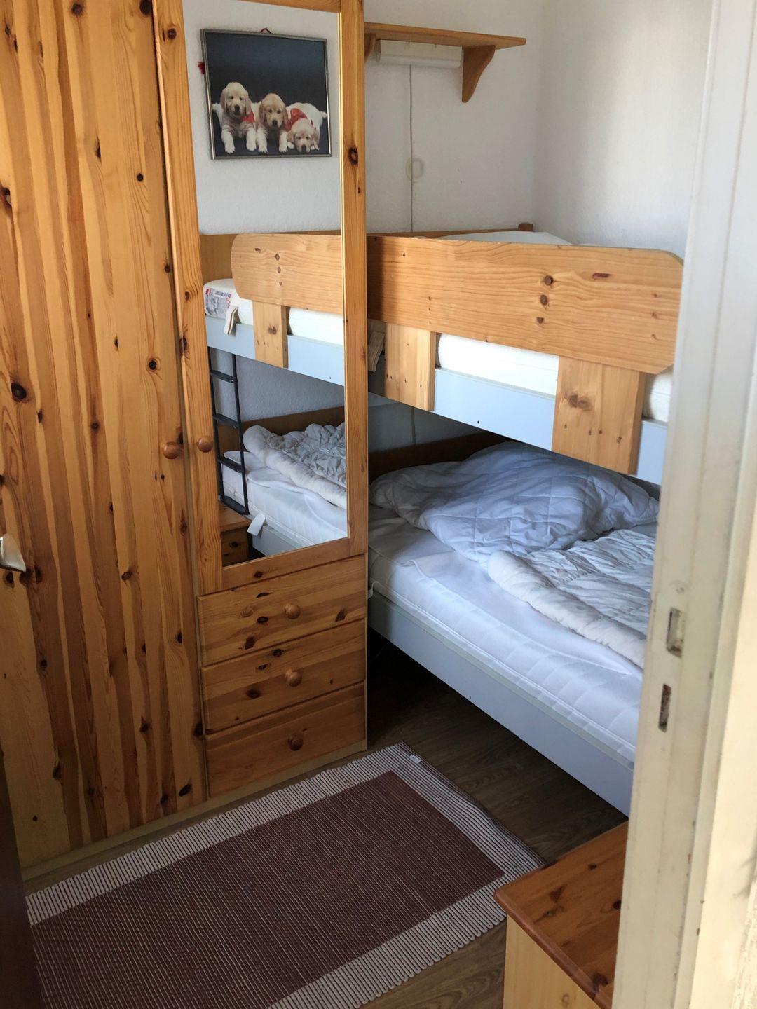 Das Flachdachgebäude verfügt über ein kleines, zweckmäßiges Duschbad, ein Schlafzimmer mit Etagenbett (je 90*190) sowie ein weiteres Schlafzimmer mit 2 Einzelbetten (je 100*200).