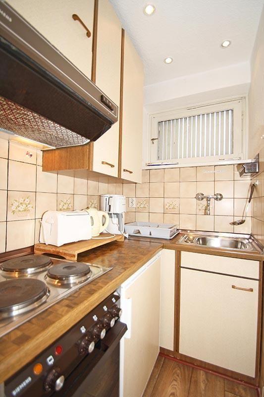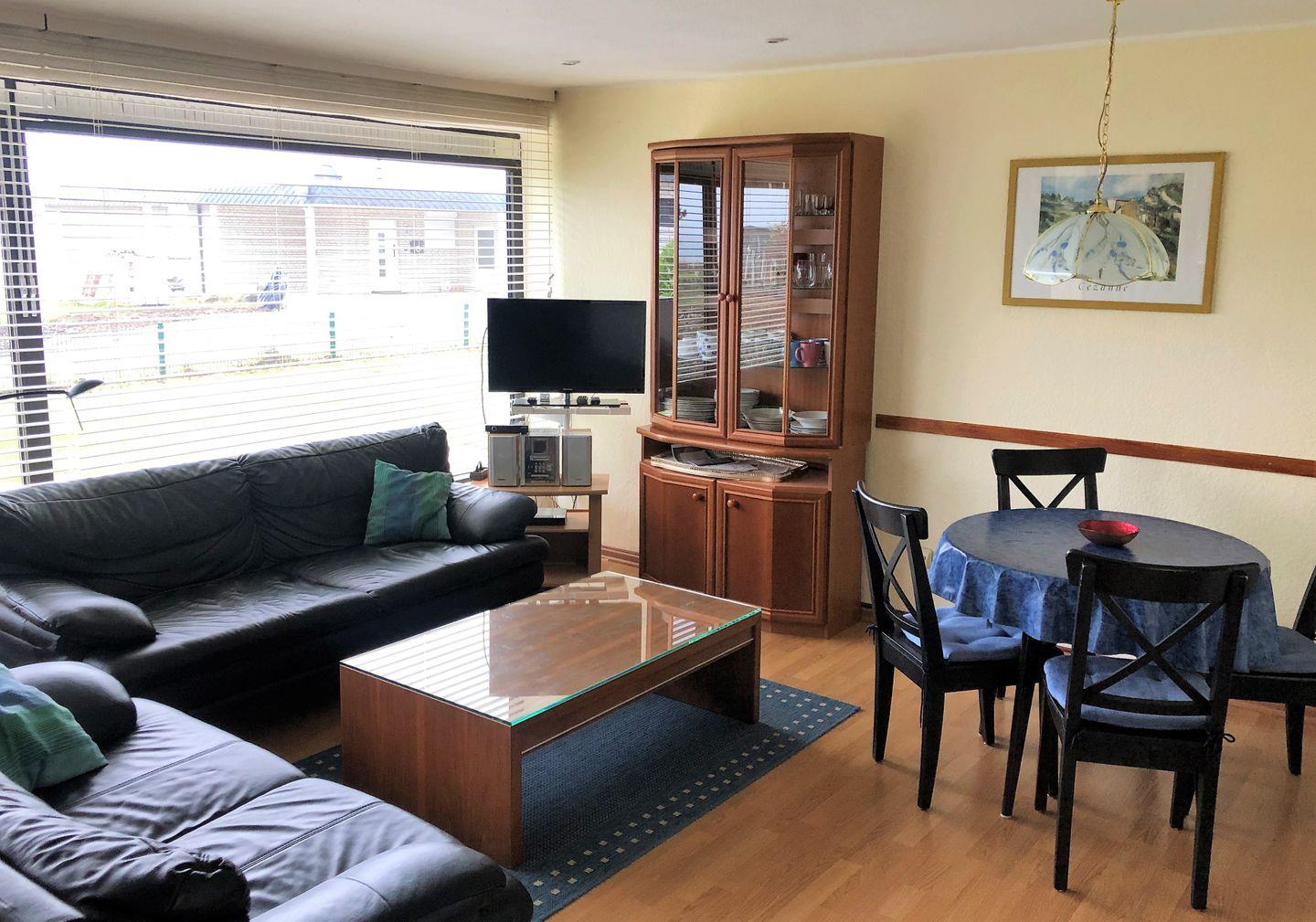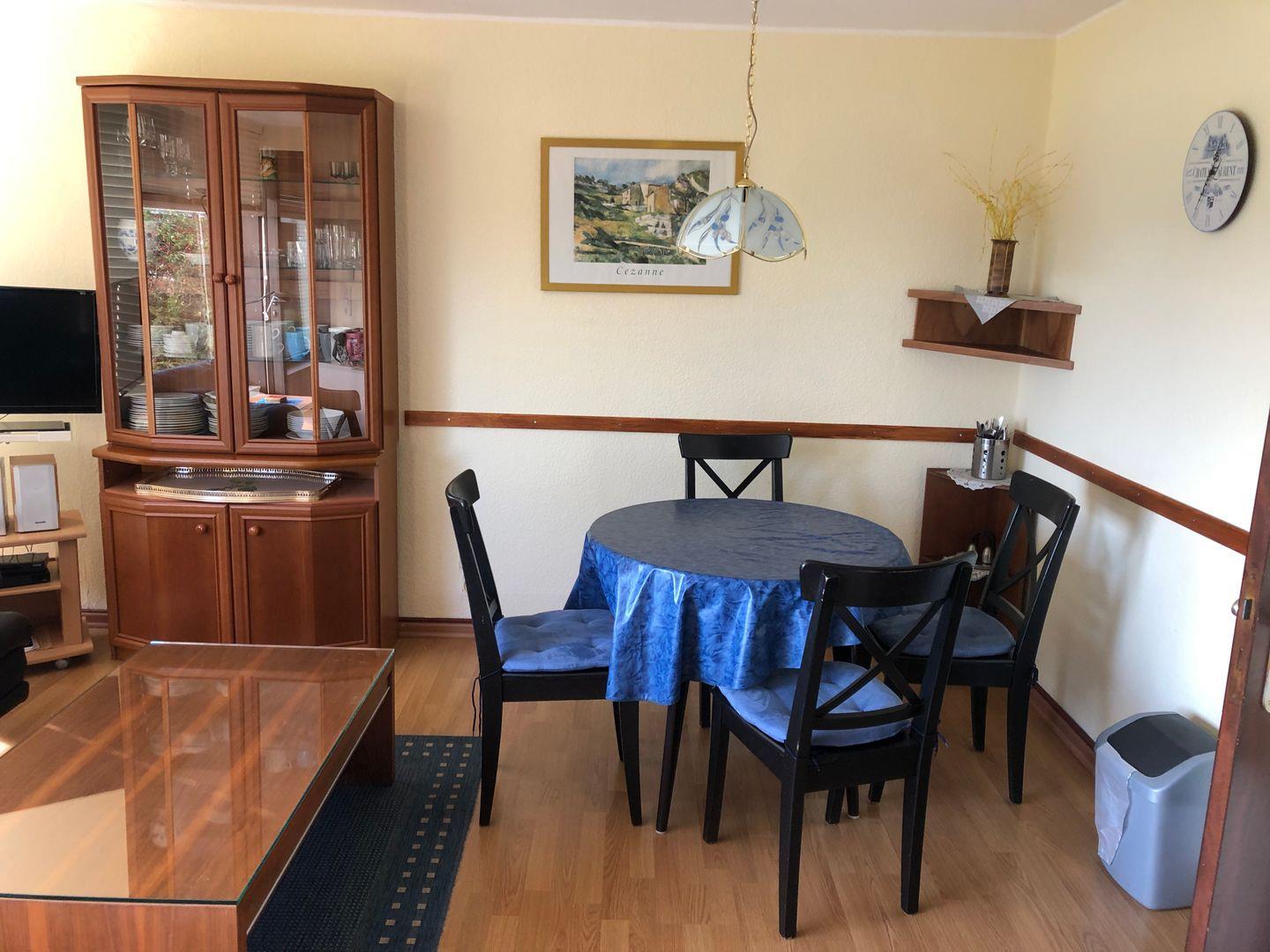 Im Wohn-/Esszimmer finden Sie einen runden Esstisch an dem Sie Ihre, in der angrenzenden Einbauküche zubereiteten Mahlzeiten einnehmen können. Backofen, Vier-Platten-Herd mit Dunstabzugshaube, Tischgeschirrspüler und Microwelle stehen Ihnen in der kleinen, funktional ausgestatteten Küche bereit.