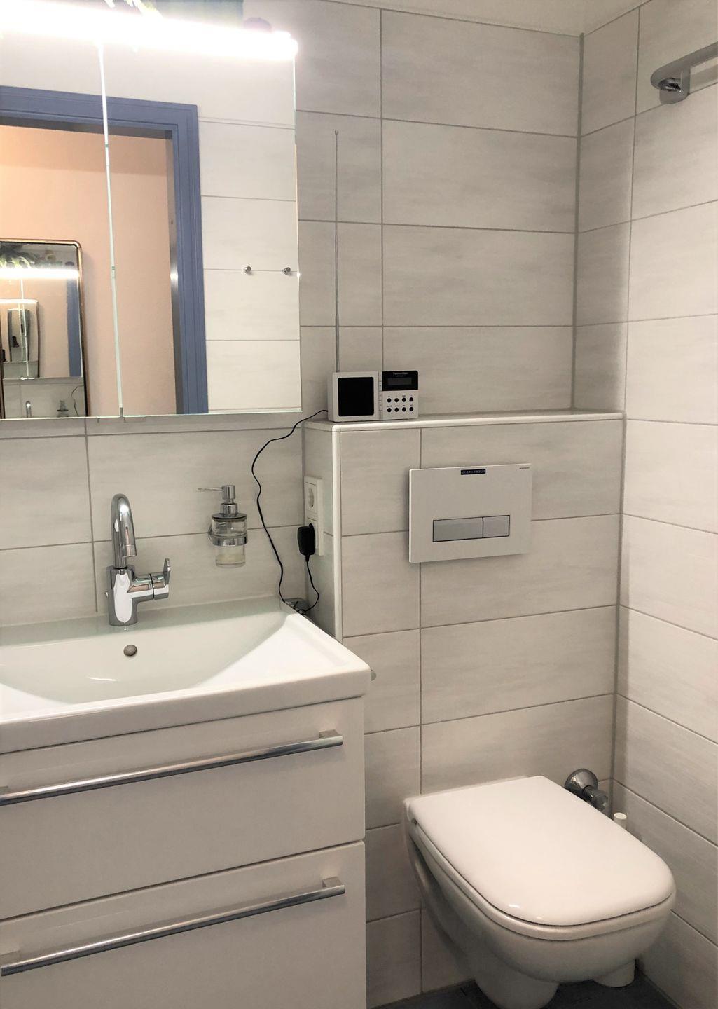 Das moderne Bad verfügt über eine extragroße Dusche mit Glaswänden, klappbarem Duschsitz und niedrigem Einstieg.