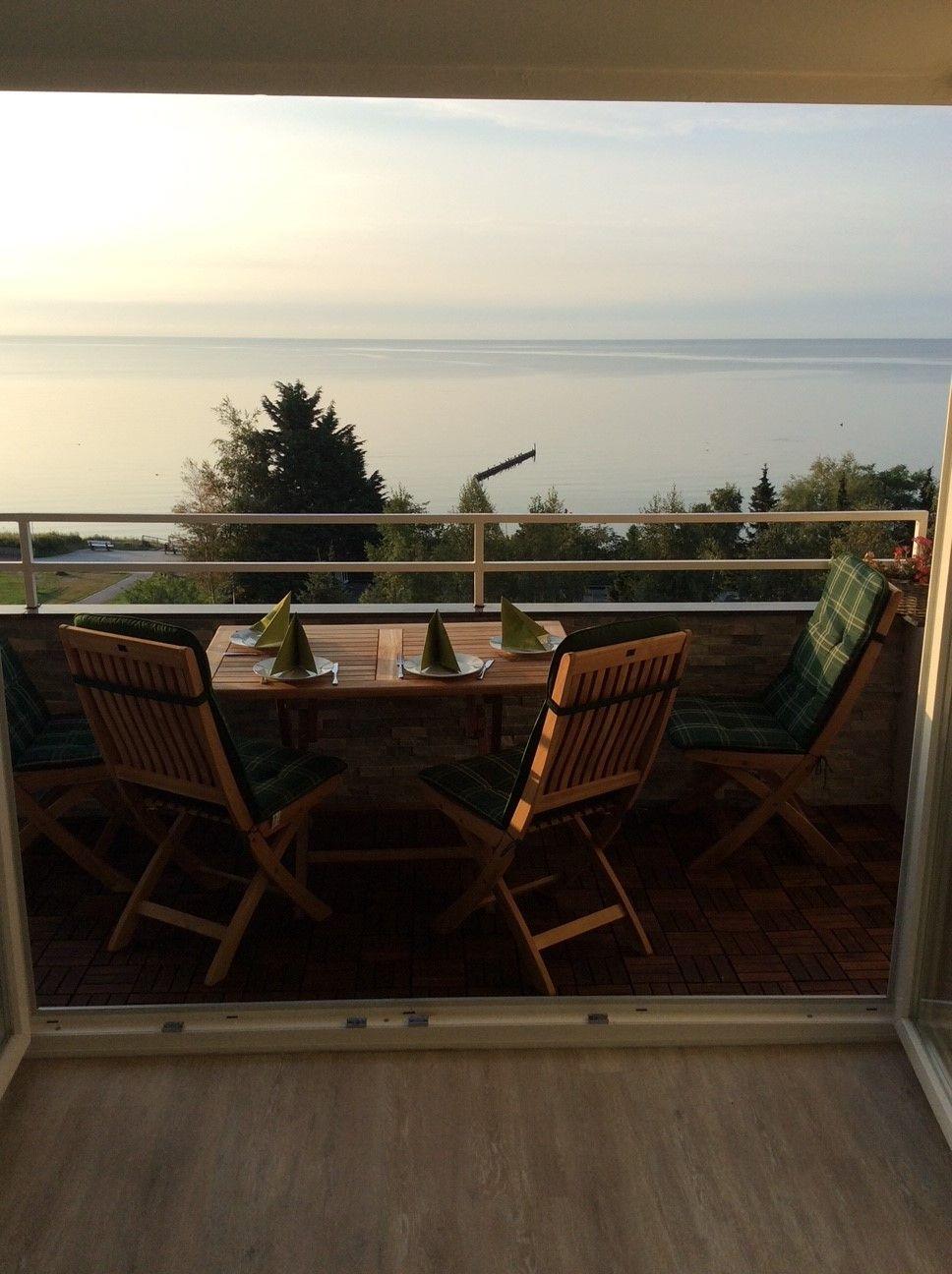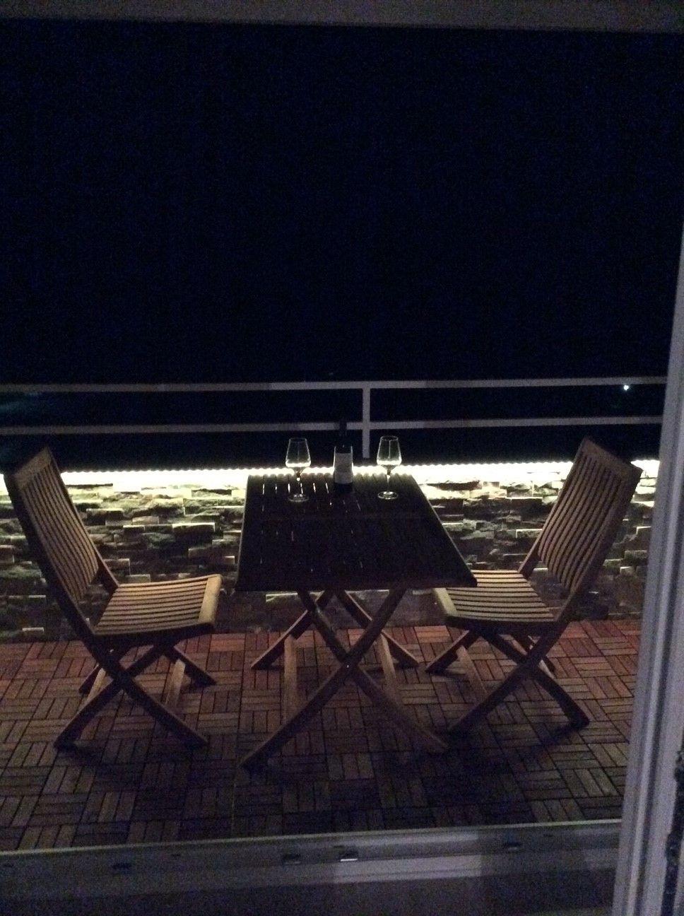 Der Balkon wurde stilvoll mit Holzmöbeln ausgestattet, dekoriert und mit romantischen Lichtquellen versehen. Genießen Sie hier von vormittags bis spätnachmittags die Sonne und den fantastischen Blick aufs Meer!