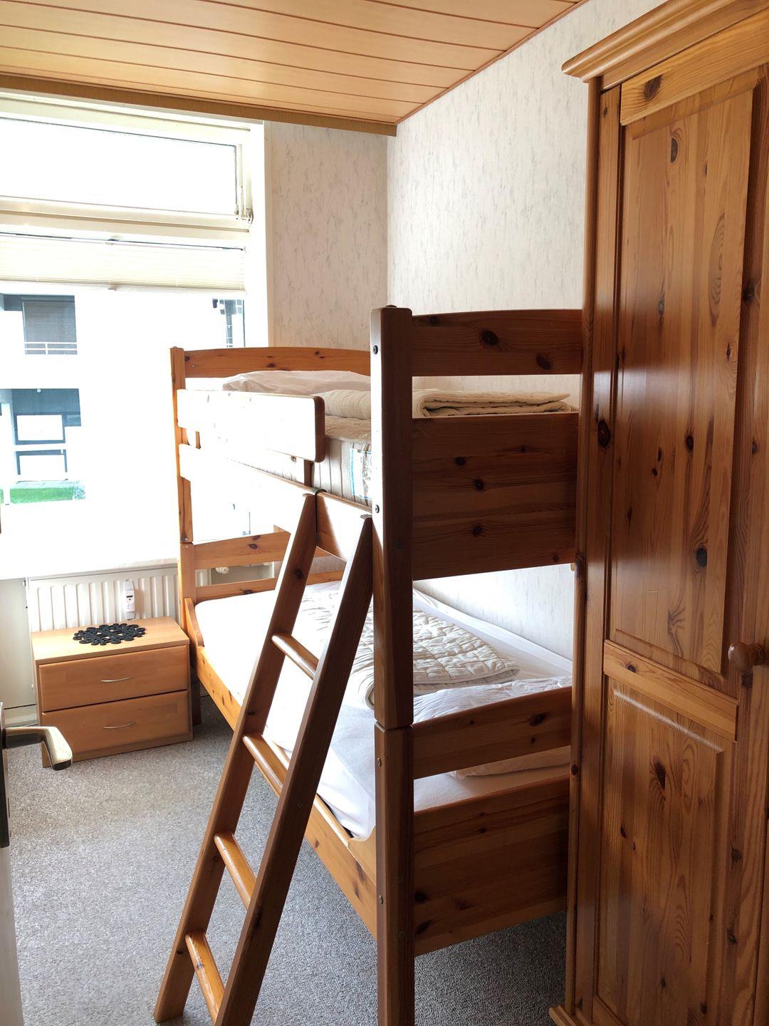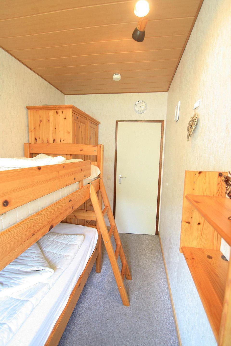 Das mit Teppich ausgelegte Kinderschlafzimmer ist mit Etagenbett, Kleiderschrank (mit Safe) und Nachttisch aus Kiefernholz eingerichtet. Ein Plissee am Fenster sorgt für Privatsphäre.